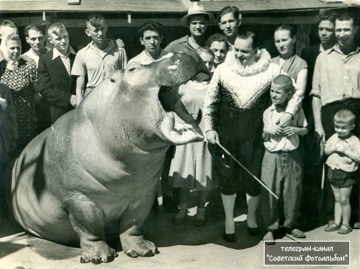 Львов, 1950-е: дрессировщик Владимир Дуров выводит бегемота на городскую прогулку — будто это крупная собака, просто “чуть-чуть” больше. В кадре главное даже не зверь, а реакция прохожих: смесь любопытства и уважительного “ничего себе”.