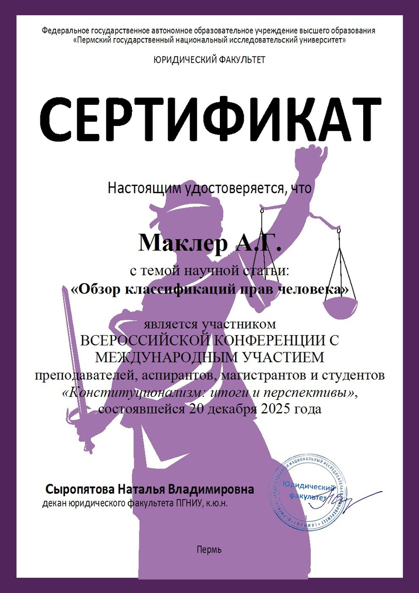 человека, а также обеспечения верховенства права и правопорядка, мною разрабатывается образовательная программа по дисциплине «Права человека». Программа курса предполагает изучение ключевых аспектов правового статуса личности, международно-правовых норм и стандартов в области прав человека, а также национальных механизмов их имплементации и защиты. Особое внимание будет уделено вопросам соблюдения прав человека в различных сферах общественной жизни, включая право на жизнь, свободу и личную неприкосновенность, свободу мысли, совести и религии, право на справедливое судебное разбирательство, право на участие в управлении государством и другие. Запуск курса планируется в середине 2026 года, что позволит обеспечить его актуальность и соответствие современным тенденциям в развитии международного и национального права. Курс будет ориентирован на студентов юридических факультетов, а также на широкий круг специалистов, заинтересованных в углубленном изучении вопросов прав человека и их прак