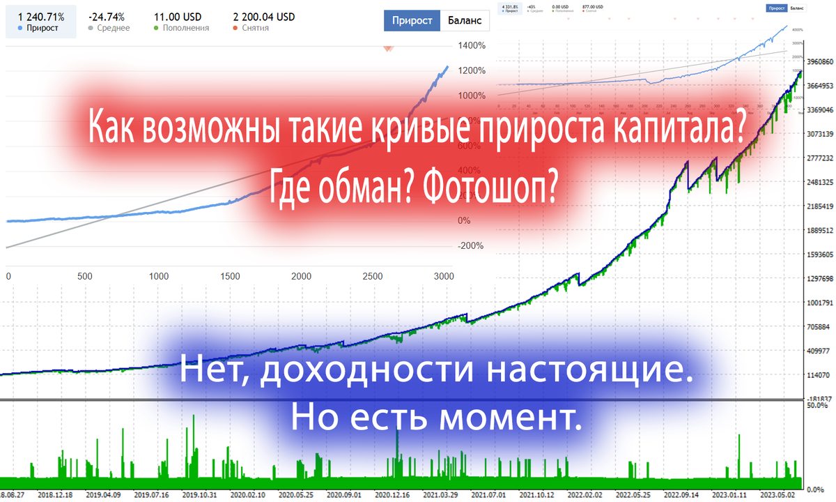 И ладно системы, роботы. Мало ли что там можно нарисовать на истории. Но есть системы автоследования, которые фактически работают. Ведь их график рисует не автор, а компания, предоставляющая услуги, которая объективно и независимо тупо даёт результаты реального счета, на котором идет реальная торговля.
