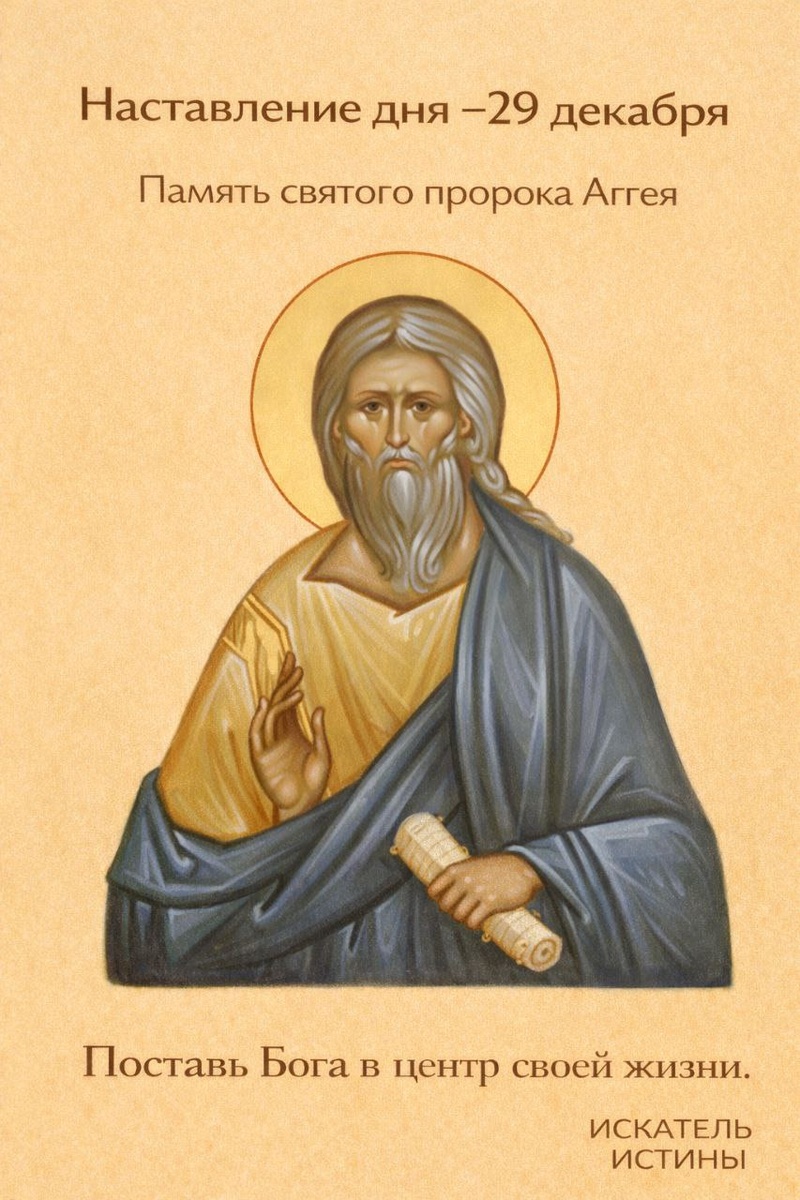 Память святого пророка Аггея Пророк Аггей был послан Богом в трудное время, чтобы пробудить народ от духовного охлаждения и напомнить о главном — о верности Господу. Он призывал не откладывать добро, не ставить земное выше небесного и прежде всего заботиться о храме Божием — как внешнем, так и внутреннем. Его слово учит нас ответственности за свою духовную жизнь и напоминает: когда человек ставит Бога на первое место, всё остальное становится на своё место. Пусть и твой день будет наполнен вниманием к душе, решимостью исправлять сердце и доверием Божьему промыслу.
