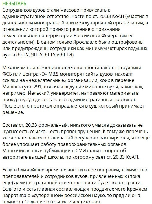 А российская наука, слава Богу, начинает медленно, с опаской и ооочень аккуратно разворачиваться в сторону суверенитета. Особенно и в первую очередь критично это для всей гуманитарной сферы. Другой вопрос в том, что никто не отменял один из столпов правовой системы - "ЗАКОН ОБРАТНОЙ СИЛЫ НЕ ИМЕЕТ". Грубо говоря, если ректор Институт исследования всего подряд Вася Иванов сотрудничал с неким ныне запрещённым западным ВУЗом, но когда этот ВУЗ стал запрещённым, то перестал, то наказывать Васю нельзя, Вася - хороший и законопослушный.