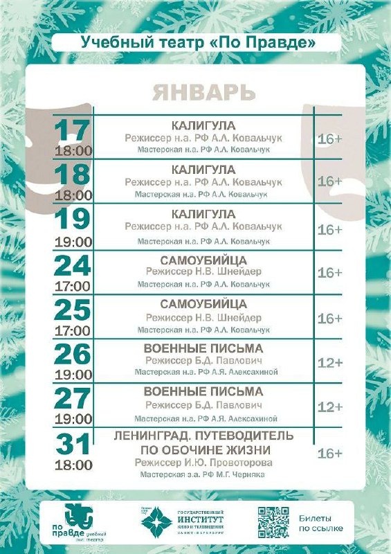 В этот день студенты 4 курса кафедры актерского мастерства, мастерской народной артистки России Анны Ковальчук, покажут спектакль «Калигула». Премьера прошла с оглушительным успехом в декабре. 💥24 января состоится премьера спектакля "Самоубийца" по одноименной пьесе Николая Эрдмана. В постановке задействованы студенты мастерской Анны Ковальчук. Режиссер спектакля – заведующий кафедрой Николай Шнейдер. Это история о безработном Семене Семеновиче Подсекальникове, который в попытке быть замеченным собирается покончить с собой. 💥К памятной дате, Дню полного освобождения Ленинграда от фашистской блокады, будут приурочены показы двух спектаклей. 26 и 27 января можно увидеть постановку, основанную на семейных историях студентов, мастерской народной артистки России Анны Алексахиной "Военные письма". Премьерные показы прошли с аншлагом. Многие зрители отметили вокальный талант исполнителей и драматические до мурашек рассказы о военных годах. 💥31 января состоится ещё одна премьера – спекта