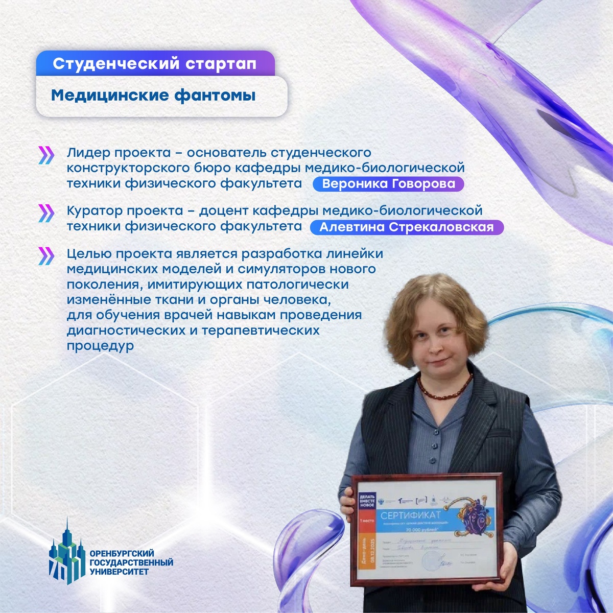 Первое место и 70 000 рублей на развитие своего стартап-проекта «Медицинские фантомы» получила лидер студенческого конструкторского бюро физического факультета Вероника Говорова. Подробнее о разработке можно прочитать на карточке.