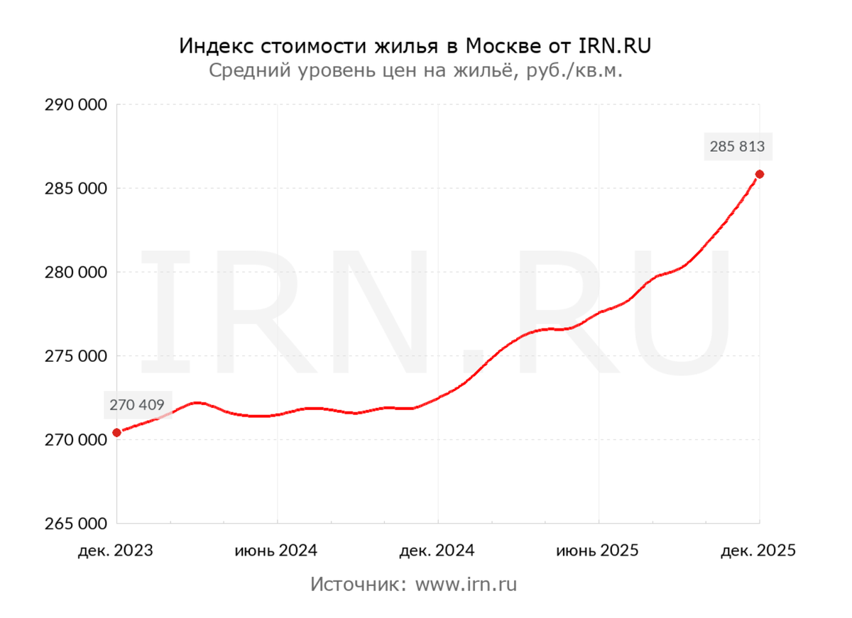 За год цены на жилье в столице выросли менее чем на 5%. В 2025 году рынок вернулся к сбалансированным показателям. Цены в столице выросли с 272,5 до 285,8 тыс. рублей за кв. м. (без учета элитки), по данным IRN. Т. е. на 4,9% — умеренный рост примерно на уровне инфляции. Если не считать информационного скандала с Долиной, за целый год не было замечено никаких факторов, которые бы спровоцировали ажитаж или обвал спроса. При этом весь год с рынка вымывались наиболее доступные предложения. Индекс стоимости дешевого жилья (20% самых дешевых квартир) прибавил 6,5%. А откровенно переоцененные предложения дешевели. ✔ Если в 2026 году не произойдет форс-мажоров, то он повторит 2025-й. С одной стороны, на цены продолжит давить дорогая ипотека. С другой, им не дадут упасть высокая инфляция, рост денежной массы и ограниченное предложение. Эти противоборствующие факторы продолжат уравновешивать друг друга. Все тренды и аналитика рынка недвижимости — в нашем канале «Недвижимость | Что Где Почём» (D