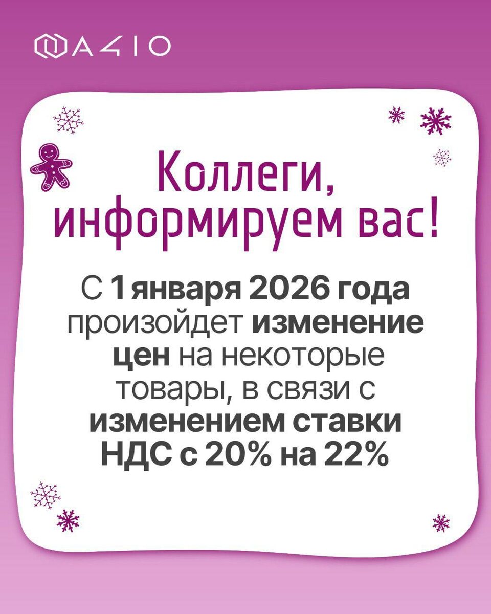 ! 🤝 ❗Хотим проинформировать вас об изменении ставки НДС на некоторые товары с 20% до 22% с 1 января 2026 года🗓️ ⚡Сделать заказ можно у персонального менеджера, на сайте https://clck.ru/3QrspK или по 📱номеру 👉 8 800 550 0 410 ⚡Для получения полного прайс-листа 👉 http://clck.ru/38NMpp 💣Скачивайте приложение A410 и совершайте покупки в один миг: iOS → https://clck.ru/3PaaQ2 Android → https://clck.ru/3PabuT RuStore→ https://clck.ru/3QR2by #Важная_информация
