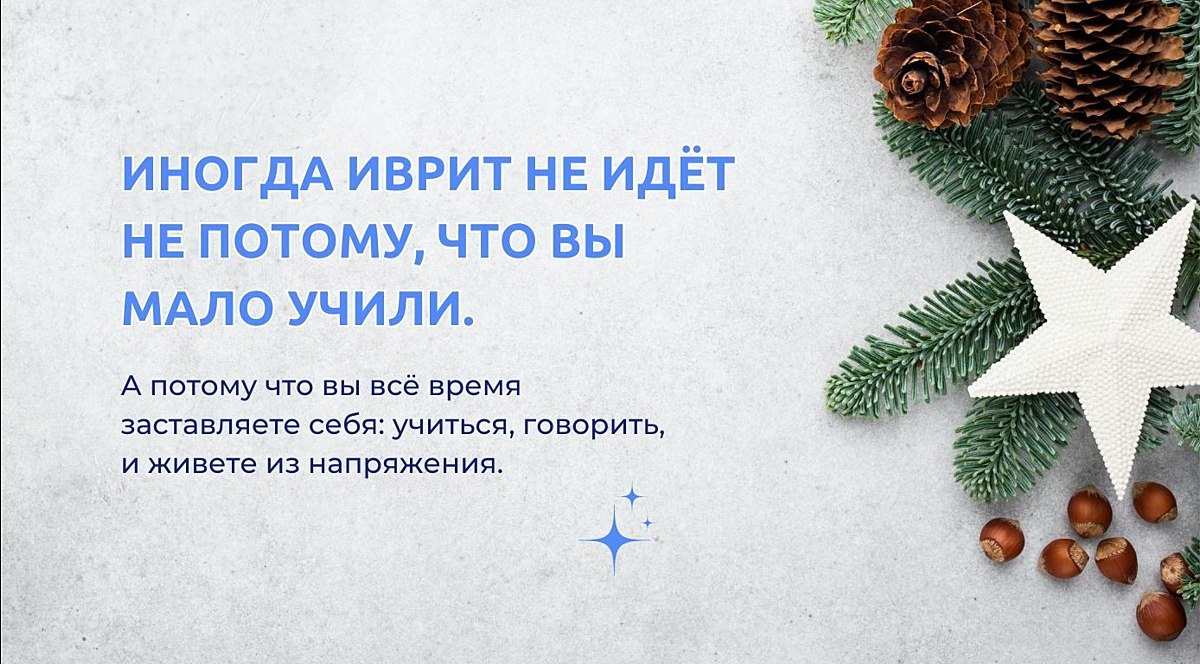 Вчера я провела эфир "Как реально поднять уровень иврита в 2026". Говорили, почему иврит может годами стоять "на паузе", даже если вы учили и старались. Спасибо всем, кто был 💙 Запись доступна ещё 24 часа: https://materials.ivrika.ru/zapis-web-2026 Иногда иврит застревает не потому, что вы мало учили. А потому что вы всё время заставляете себя. Самый частый запрос: "Я не могу заставить себя учить иврит". И вот правда: заставлять себя- тупиковый путь. Можно иначе. Спокойно. Регулярно. 🧠 Речь — это не знание. Речь — это состояние. Как танец: если тело зажато - движения не случается. Особенно это чувствуют новые репатрианты, когда язык нужен "прямо сейчас". Иврит не запускается из напряжения. 🌸 Поэтому я создала Клуб ИВРИКА - пространство, где язык постепенно становится частью жизни. Без давления. В своём темпе. 👉Хотите посмотреть, как всё устроено? https://ivrika.ru/url/klubtgc