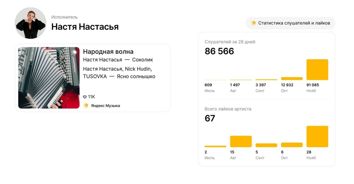 На вчерашней встрече с артистом мы разбирали кейс Насти Настасьи и искали причину резкого роста слушателей в Яндекс.Музыке. На скринах как раз тот самый момент, где видно: рост не плавный, а скачкообразный. А у такого роста всегда есть конкретное объяснение, «просто так» в Яндексе ничего не стреляет. Мы пошли разбирать по шагам, что могло повлиять. Есть всего несколько рабочих причин, по которым Яндекс начинает активно масштабировать трек: ✅ Вирусность в соцсетях Когда ролик с треком залетает, люди массово переходят слушать. В этом кейсе вирусности не было. Ни пересъёмов, ни роста по соцсетям. ✅ Таргет Таргет не может привести десятки тысяч слушателей напрямую, но он может дать первые сигналы алгоритму. Люди слушают, дослушивают, переслушивают и трек попадает в «Мою волну». Здесь этот фактор тоже не был основным. ✅ Фит с артистом с большими цифрами И вот здесь мы нашли ответ. В релизе есть фит с артистом TUSOVKA, у которого 4,5 млн слушателей в месяц. Это очень простой, но часто
