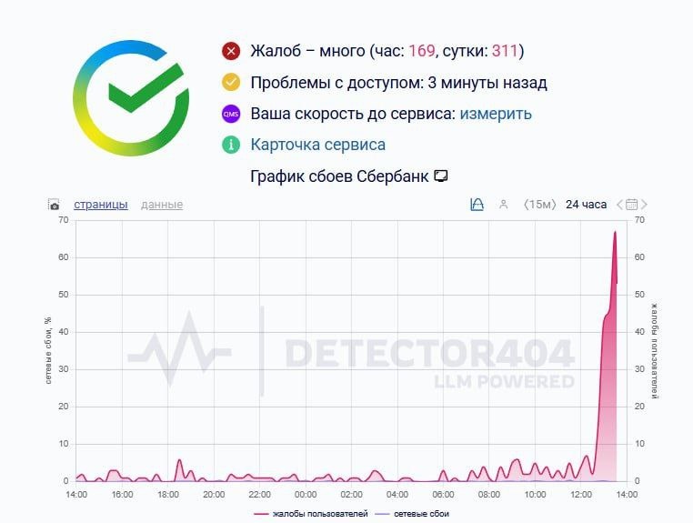 На сайте Downdetector уже несколько тысяч жалоб. Больше всего жалоб поступает на работу сайтов и мобильных приложений. Т-банк и "Сбер" опровергли сообщения о проблемах в работе их сервисов, сообщили в пресс-службах кредитных организаций.