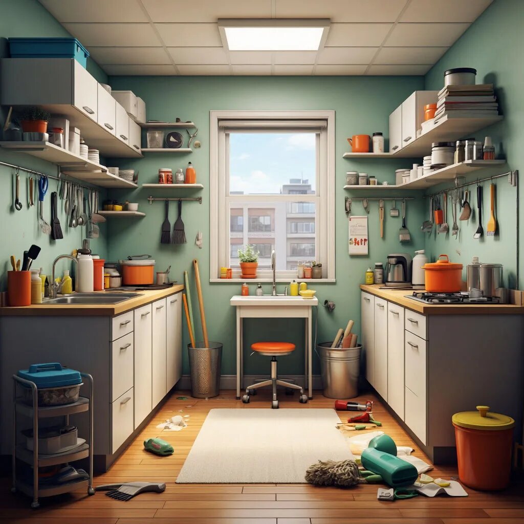- 4. Организация пространства: минимизируйте количество предметов на высоких полках и в узких зонах — меньше вещей = меньше пыли.