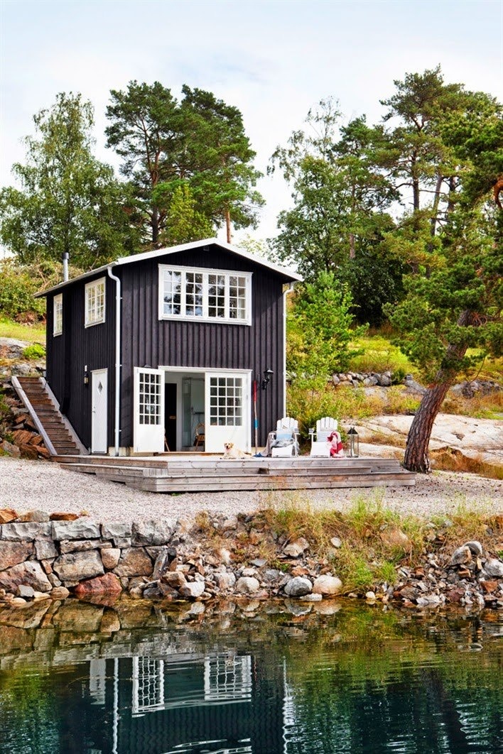 скандинавский летний домик (коттэдж), расположенный на скалистом берегу у воды