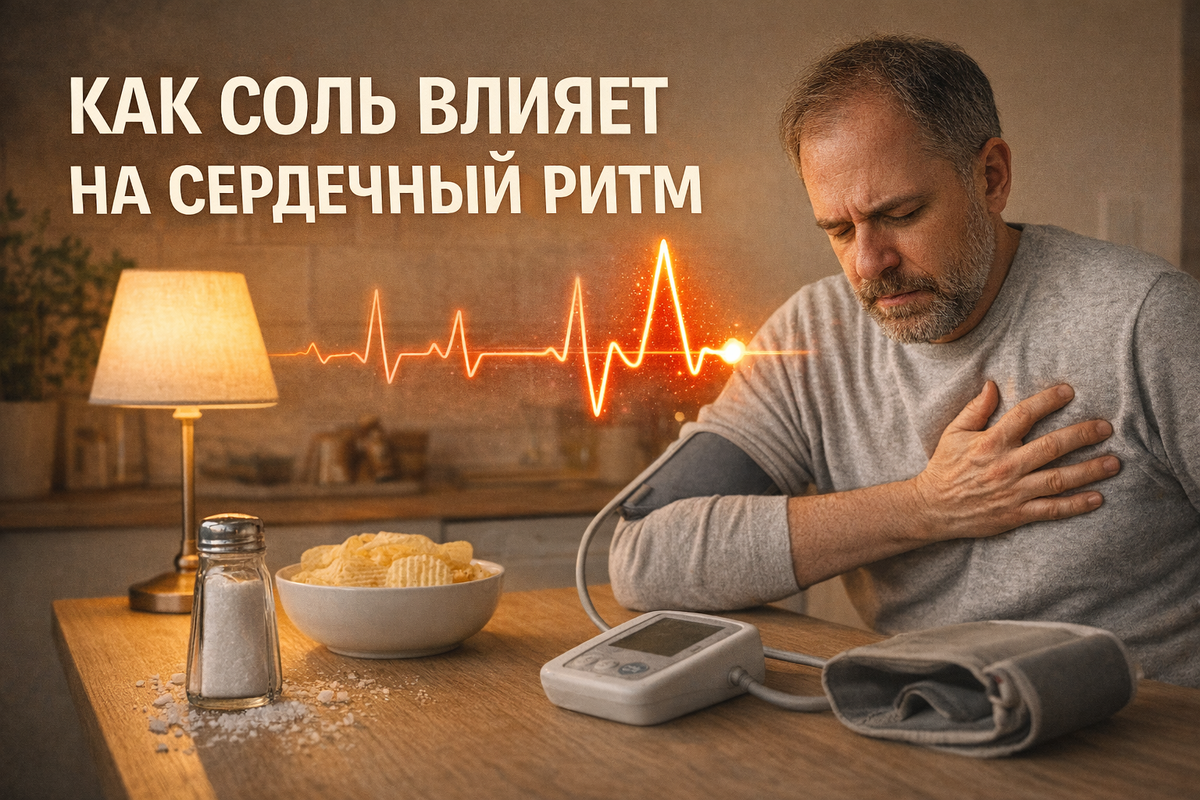 Мы привыкли ассоциировать соль с давлением. Но влияние соли на сердечный ритм — менее очевидная, но не менее важная история. Особенно после 40 лет, когда даже небольшие отклонения в ритме сердца становятся маркером скрытых проблем. Сердце — это не просто насос. Его работа регулируется сложной системой: электролиты, гормоны, автономная нервная система. И соль — один из главных факторов, влияющих на эту систему. Разберёмся по порядку — без паники и без мифов. Соль — источник натрия, который нужен организму: Но избыток натрия: Сердце работает благодаря скоординированным электрическим импульсам. Эти импульсы зависят от баланса электролитов — натрия, калия, кальция и магния. Избыток натрия: Избыток соли активирует симпатику — "боевую" часть нервной системы: При высокой соли организм начинает терять магний и калий — а они, как раз, стабилизируют сердечный ритм.
