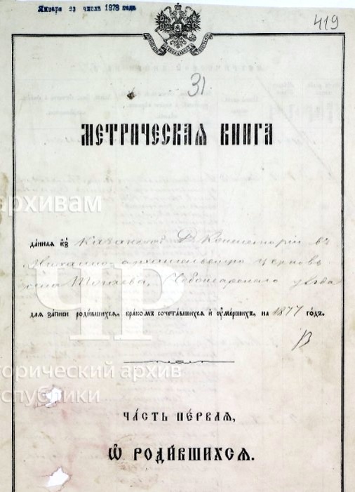 Государственный исторический архив Чувашской Республики. Фонд № 557, опись № 8, дело № 167. Стр. 415 скан. Метрическая книга, данная из Казанской духовной консистории, в Михаило-Архангельскую церковь села Тогаева Чебоксарского уезда для записи родившихся, браком сочетавшихся и умерших на 1877 год. Часть первая. О родившихся. Стр. 425 скан. Май. № 20. 12 числа родилась. 15 числа крещена. Ирина. Родители: Деревни Ус-Касов крестьянин Никита Тимофеев и законная его жена Матрена Васильева, оба православные. Восприемники: этой деревни крестьянина Григория Федорова дочь девица Дарья Григорьева. Таинство крещения совершали: Священник Григорий Оточев. Диакон Георгий Малов. Псаломщик Иван Добров. № 24. 24 числа родился. 29 числа крещен. Иван. Родители: Деревни Вурманкасов крестьянин Алексей Никитин и законная его жена Агапия Максимова, оба православные. Восприемники: Этой же деревни крестьянин Кодрат Егоров. Таинство крещения совершали: Священник Иоанн Краснов. Диакон Георгий Малов. Псаломщик И