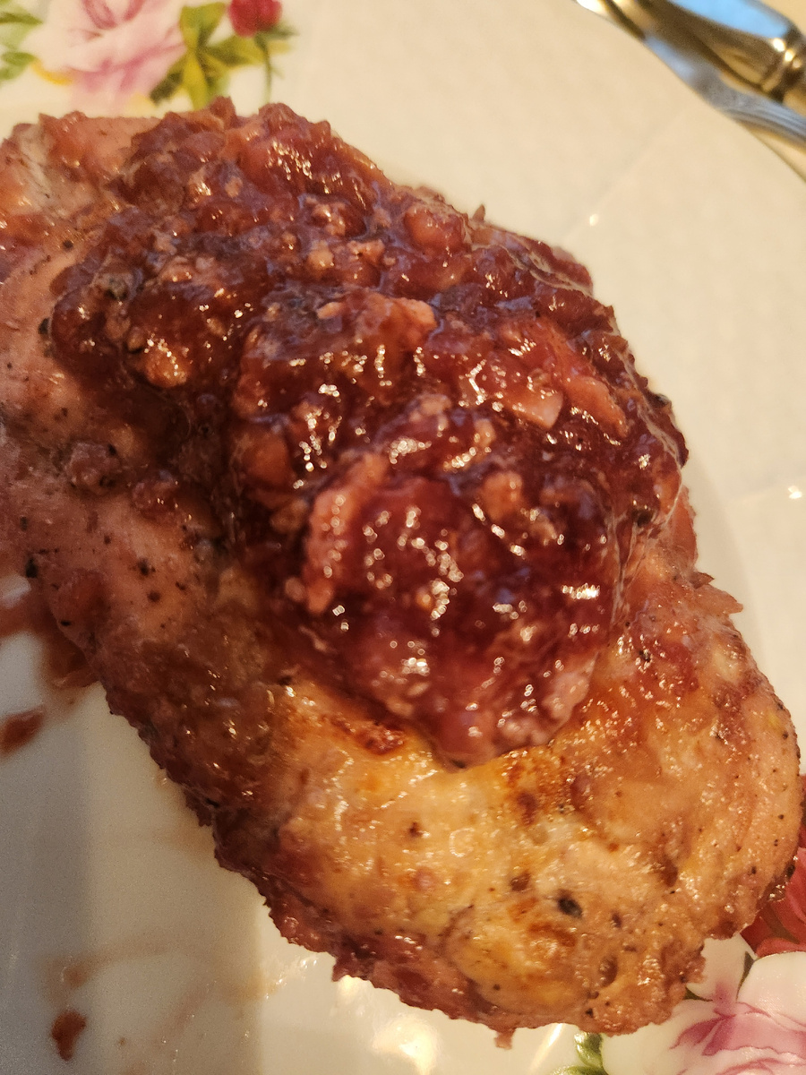 В этот раз мы пробили блендером клюкву с медом и полили грудки за 10 минут до выключения, но это не обязательно.