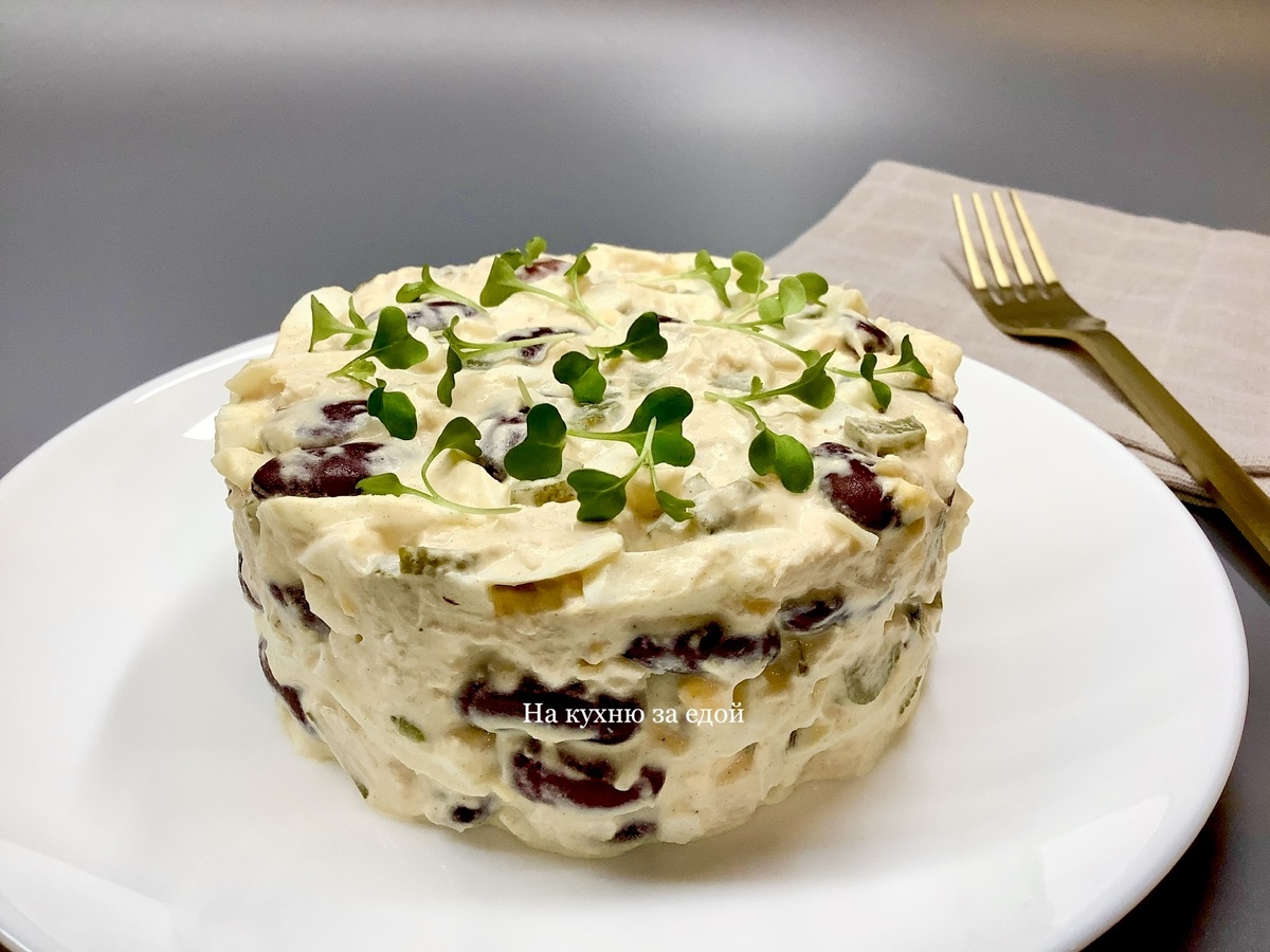 Куриное мясо можно запечь, но важно не пересушить его, чтобы оно оставалось нежным и сочным. Я использовала вареную куриную грудку, так как заправка достаточно жирная. Приготовление салата не займет много времени. Куриное филе, вареные яйца и консервированные огурцы нужно нарезать кубиками или тонкими полосками. Все ингредиенты смешать в глубокой миске, добавить фасоль и заправить майонезом со сметаной. • Варёная куриная грудка — 250 г • Вареные яйца — 5 шт • Консервированная красная фасоль — 1 банка • Консервированные огур