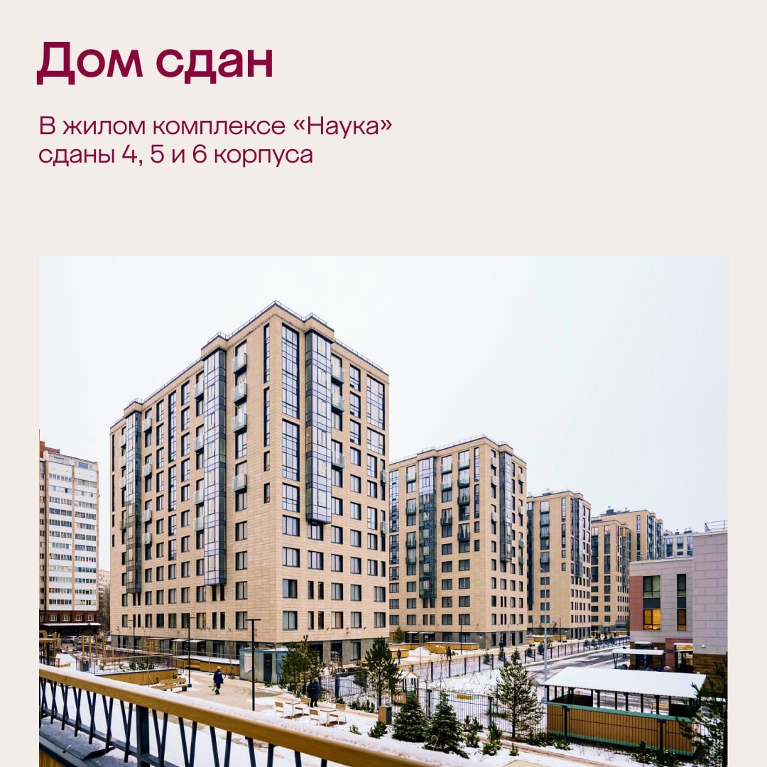 4, 5 и 6 корпуса ЖК «Наука» – это три дома высотой 11 этажей, включающие семейные двух- и трехкомнатные квартиры со средней площадью 75,5 кв. м. Студии отсутствуют. Проект благоустройства и озеленения территории квартала выполнен студией ландшафтного дизайна DEREVO PARK. Во дворах между корпусами находятся детские игровые комплексы с качелями и горками, песочницы для малышей, а также зоны отдыха с перголами и площадка для воркаута. Озеленение территории сочетает в себе как хвойные вечнозеленые, так и лиственные деревья. В составе домов построен подземный паркинг с доступом на лифте и бесконтактной системой въезда, а на первых этажах расположены коммерческие помещения. Сегодня проект семейного жилого квартала «Наука» полностью завершён. В 2024 году были введены в эксплуатацию 1-й и 9-й корпуса на 1202 квартиры, общеобразовательная школа на 1125 учеников и детский сад на 280 мест. Во втором квартале 2025 года сданы 2-й и 3-й корпуса на 329 квартир, а также 7-й и 8-й корпуса на 296 ква