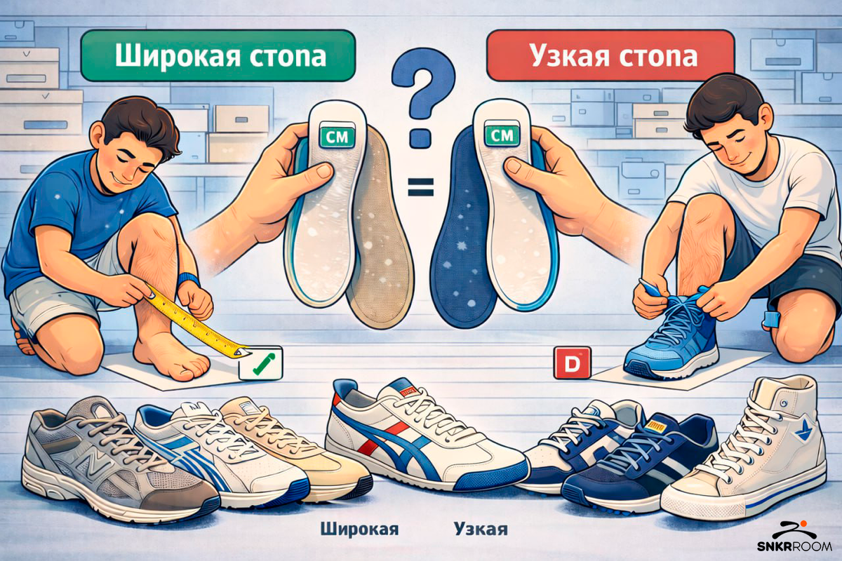 Доброго времени, вас приветствует команда SNKRROOM! Сегодня мы разбираемся, как выбрать посадку кросс для широкой и узкой стопы без примерки.