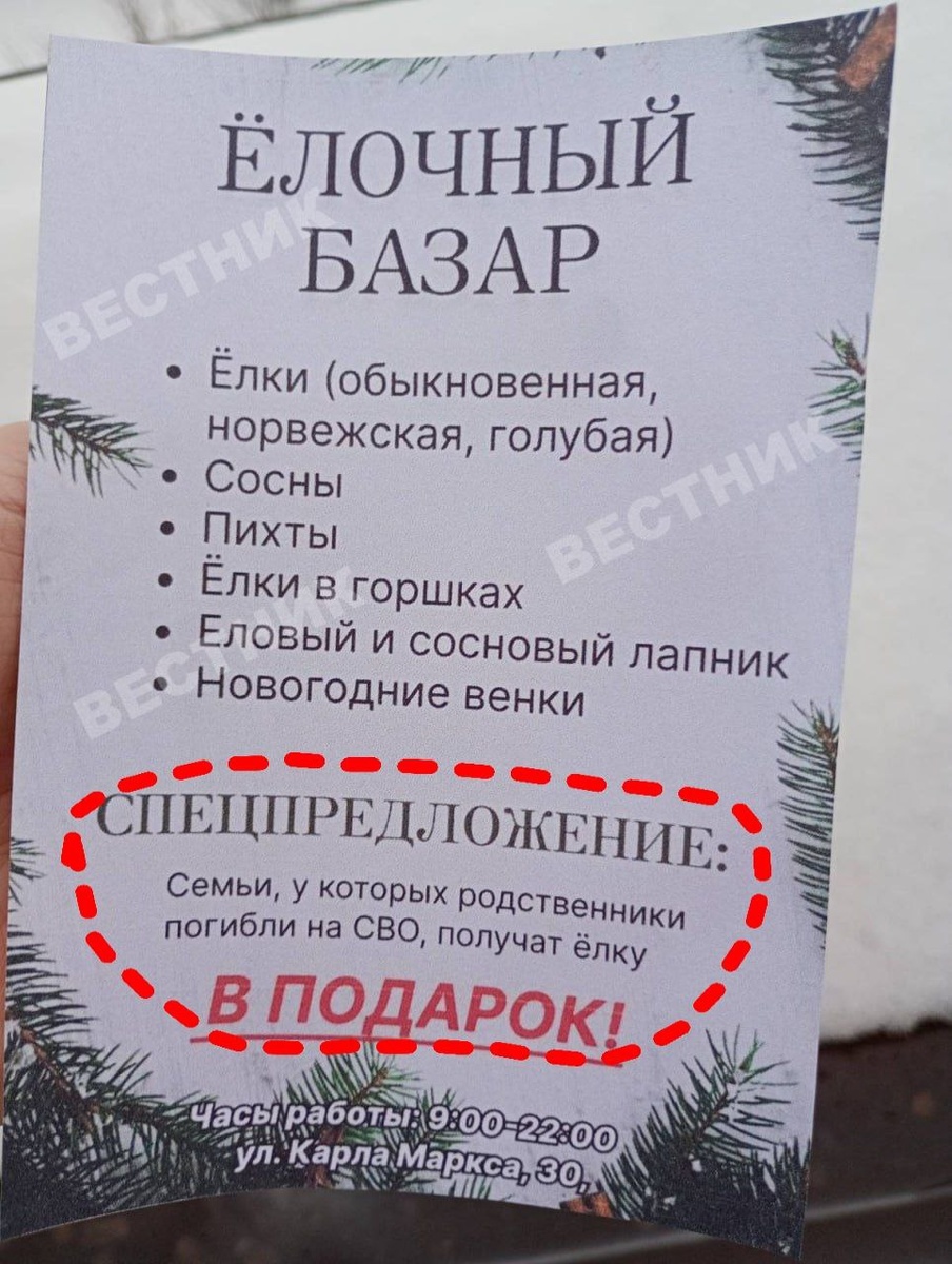 Жители Волгодонска обеспокоены тем, что в центре города распространяют брошюры. На фотографии в одной из них можно увидеть предложение о бесплатной елке в честь погибшего родственника, участвовавшего в специальной военной операции. Горожане считают, что такой текст неуместен. – Здравствуйте! Сегодня возле Дворца культуры раздавали брошюры. Я всегда беру их, когда вижу, как молодые люди стоят на холоде. В этот раз я не сразу на неё обратила внимание, а когда прочитала их дома, то была смущена. Хотя это и был подарок, но текст показался мне не совсем уместным, – рассказала жителинца города редакции «Вестника». ВЕСТНИК ВОЛГОДОНСКА