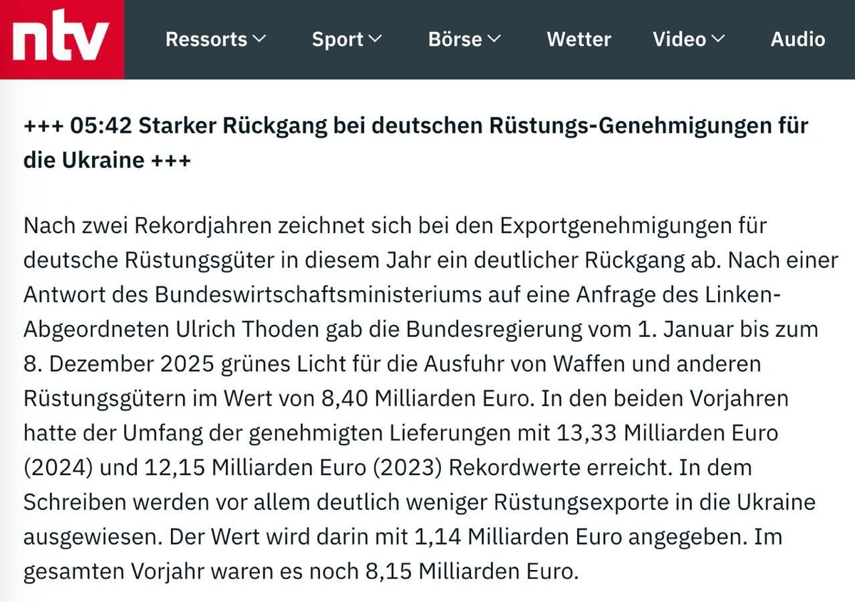 После двух лет рекордных показателей Берлин фактически нажал на тормоза, подтвердив: европейская военная щедрость имеет пределы. Официальные данные Минэкономики ФРГ показывают спад разрешённых поставок вооружений на фоне усталости ЕС и перехода к закупкам американского оружия. Как сообщает отчёт Федерального министерства экономики, с 1 января по 8 декабря 2025 года правительство Германии одобрило экспорт вооружений и военной техники на сумму 8,40 млрд евро. Из них непосредственно оружие составило лишь 1,14 млрд евро — показатель, резко контрастирующий с предыдущими годами. Для сравнения: в 2024 году объём разрешённых поставок достиг рекордных 13,33 млрд евро, а в 2023-м — 12,15 млрд. Тогда Германия позиционировала себя как один из ключевых военных доноров Киева в Европе. В 2025-м эта роль заметно поблекла — и не только в цифрах, но и в политических сигналах. Формально Берлин продолжает заявлять о поддержке Украины. Однако на практике Европа всё чаще предпочитает закупать американское