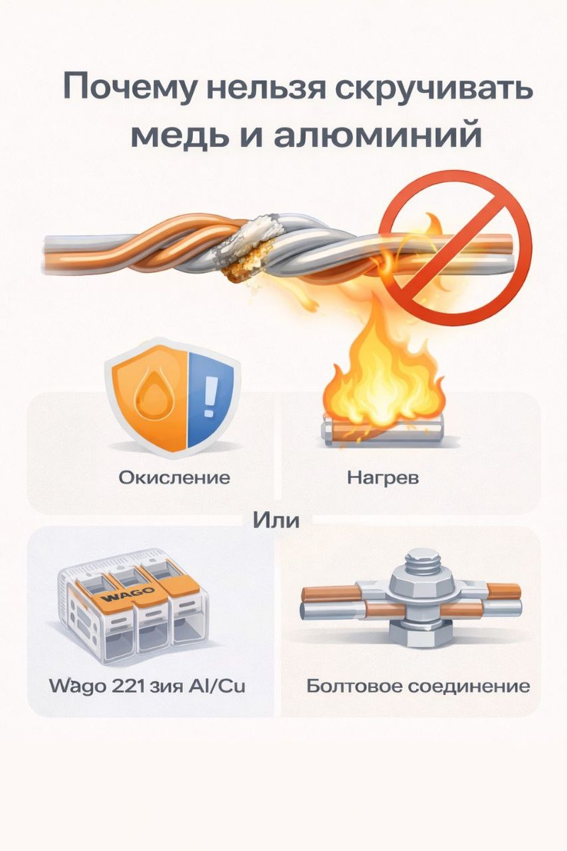 Что видно: Розетки греются, периодически пропадает свет, появляется запах гари — особенно в старых квартирах. Почему так: Медь и алюминий напрямую скручивать нельзя. Со временем контакт окисляется, растёт сопротивление, место соединения нагревается и может загореться. Что происходит на самом деле: Алюминий «течёт» и ослабевает Медь окисляется Контакт становится нестабильным Нагрев → оплавление → пожар Мини-диагностика: Дом старый, проводка алюминиевая Меняли розетки/люстры — использовали скрутку Видны потемнения, изоляция стала жёсткой Что делать правильно: Использовать клеммы WAGO для Al/Cu Либо болтовое соединение через шайбы В идеале — замена алюминия на медь Чего НЕ делать: Не скручивать напрямую Не «промазывать солидолом/литолом» Профилактика: При любом ремонте проверять все старые соединения — это слабое место всей проводки ⚡ Вопросы и сотрудничество: Telegram: @help_electrik WhatsApp: +7 967 110-14-11 🌐 https://electrik-clge.vercel.app/