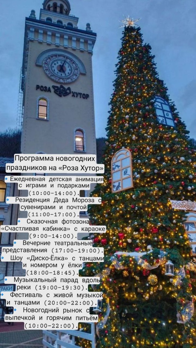 ! 🎊 с 30 декабря по 7 января "Роза Хутор" превратится в настоящую новогоднюю сказку, наполненную яркими событиями и, что самое приятное, множеством БЕСПЛАТНЫХ мероприятий! Место проведения: площадь Ратуши, Роза Долина 560. Подробности смотрите на картинке выше и планируйте свой незабываемый отдых вместе с нами! ✨ С наступающим! 🌲 🔵 Ева в MAX