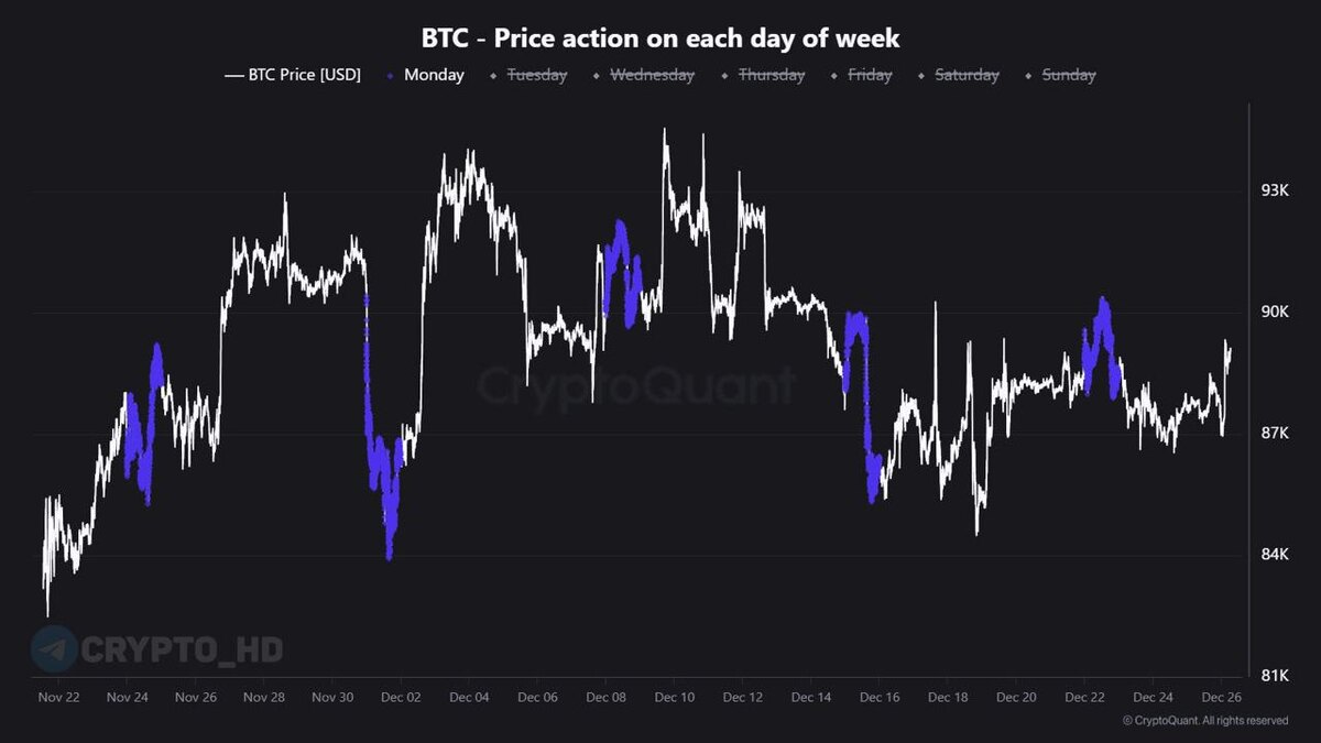🎢 CryptoQuant: Понедельник (синим) – один из самых волатильных дней недели для BTC.