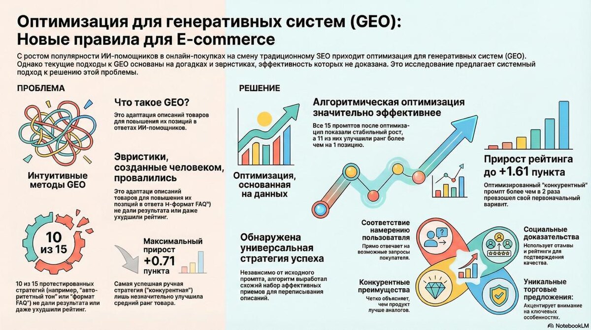 ВСТРЕЧАЙТЕ GEO — НОВЫЙ СТАНДАРТ ВЫЖИВАНИЯ В E-COM 🚨 Мир изменился: пользователи всё реже кликают по ссылкам в Google и всё чаще спрашивают совета у ИИ-ассистентов,. Если вашего товара нет в ответе ChatGPT или Amazon Rufus — для нового поколения покупателей вы не существуете,. Исследование E-GEO (ноябрь 2025) доказало: старые SEO-приемы (ключевые слова, FAQ-блоки, авторитетный тон) в 10 из 15 случаев бесполезны или даже вредят вашему ранжированию в ИИ-движках,. Почему это важно для лидеров рынка? Повышение позиции товара всего на один пункт в выдаче ИИ-ассистента может приносить десятки тысяч долларов дополнительной выручки ежегодно на один артикул. Исследователи из Колумбийского университета и MIT вывели «универсальную стратегию», которая заставляет ИИ «любить» ваш продукт,. Вот что должно быть в описании товара прямо сейчас: ✅ Фактическая точность: ИИ мгновенно считывает ложь или «воду». Сохранение жестких фактов — база,. ✅ Соответствие интенту: Описание должно предугадывать конт