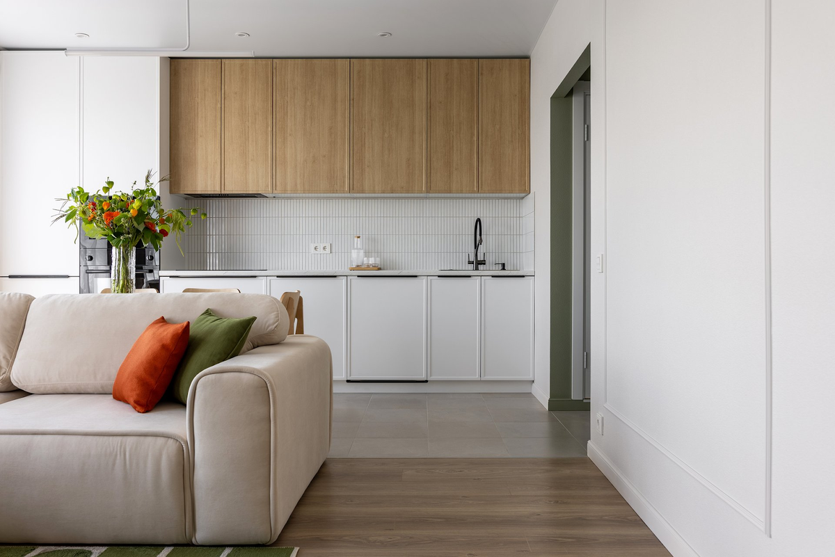 Эта квартира для жизни семьи с ребенком. С помощью приемов хоумстейджинга и с минимальными затратами на базе отделки застройщика здесь создали комфортное пространство для каждого члена семьи. Планировка от застройщика полностью подошла под задачи проекта — изменений не потребовалось. В квартире предусмотрена кухня-гостиная, две отдельные комнаты, два санузла и прихожая с местами для хранения. Кухня изготовлена на заказ по индивидуальным размерам. Здесь есть все необходимое: холодильник, духовой шкаф, СВЧ, посудомоечная машина, варочная панель и вытяжка. Обратите внимание на фасады кухни, выполненные в двух разных цветах и текстурах. Светлое дерево добавляет в интерьер ощущение уюта. Гостиная полностью оформлена мебелью от бренда divan.ru. Центральным элементом стал угловой диван Виена — удобный для отдыха всей семьи и гостей. Яркие акценты — терракотовая ТВ-тумба Квелен и подвесные полки Кливленд, оттеняющие нейтральный интерьер. Завершающим штрихом стал двусторонний ковер Monti. ➡️ То