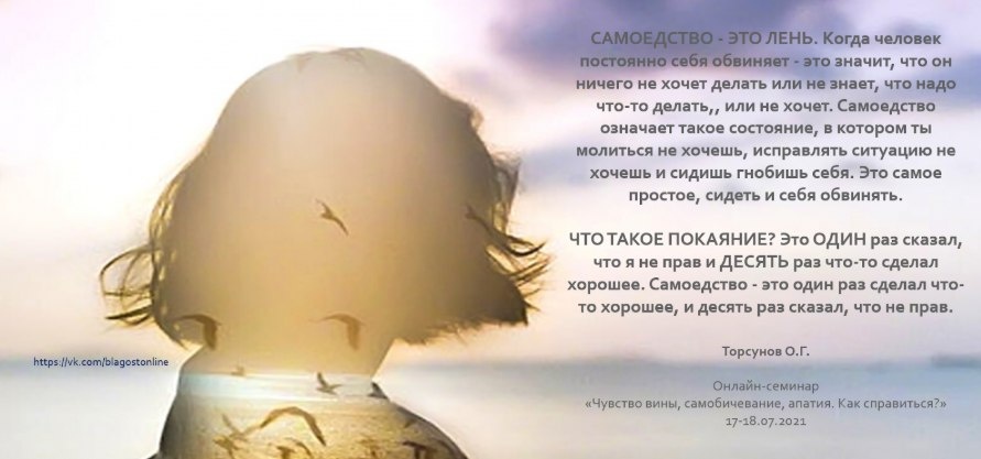 Когда человек постоянно себя обвиняет - это значит, что он ничего не хочет делать или не знает, что надо что-то делать,, или не хочет. Самоедство означает такое состояние, в котором ты молиться не хочешь, исправлять ситуацию не хочешь и сидишь гнобишь себя. Это самое простое, сидеть и себя обвинять. ЧТО ТАКОЕ ПОКАЯНИЕ? Это ОДИН раз сказал, что я не прав и ДЕСЯТЬ раз что-то сделал хорошее. Самоедство - это один раз сделал что-то хорошее, и десять раз сказал, что не прав.