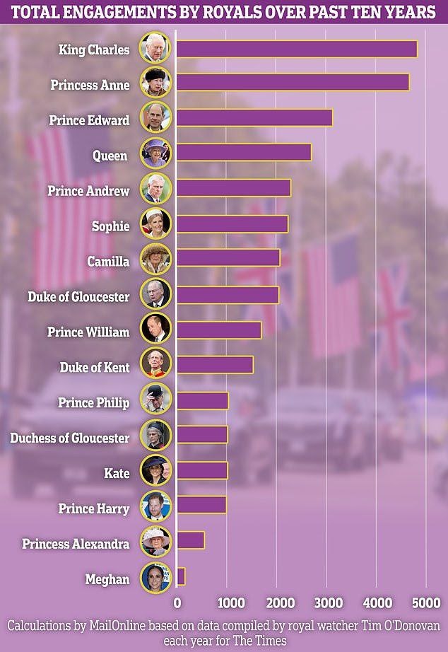 выходов за 10 лет, с 2013 по 2023 г. 1. Чарльз – 4854 2. Анна – 4693 3. Эдвард – 3155 4. Елизавета II – 2721 5. Эндрю – 2289 6. Софи – 2253 7. Камилла – 2084 8. Герцог Глостерский – 2056 9. Уильям – 1704 10. Герцог Кентский – 1538 11. Филипп – 1057 12. Герцогиня Глостерская – 1031 13. Кейт – 1024 14. Гарри – 1009 15. Александра Кентская – 574 16. Меган – 179 (Напомню, что Эндрю не работает с 2019, Филипп ушел на пенсию в 2017, смерть Елизаветы в 2022, плюс мегзит, ковид и 1 беременность Меган и 3 беременности Кейт за этот период)