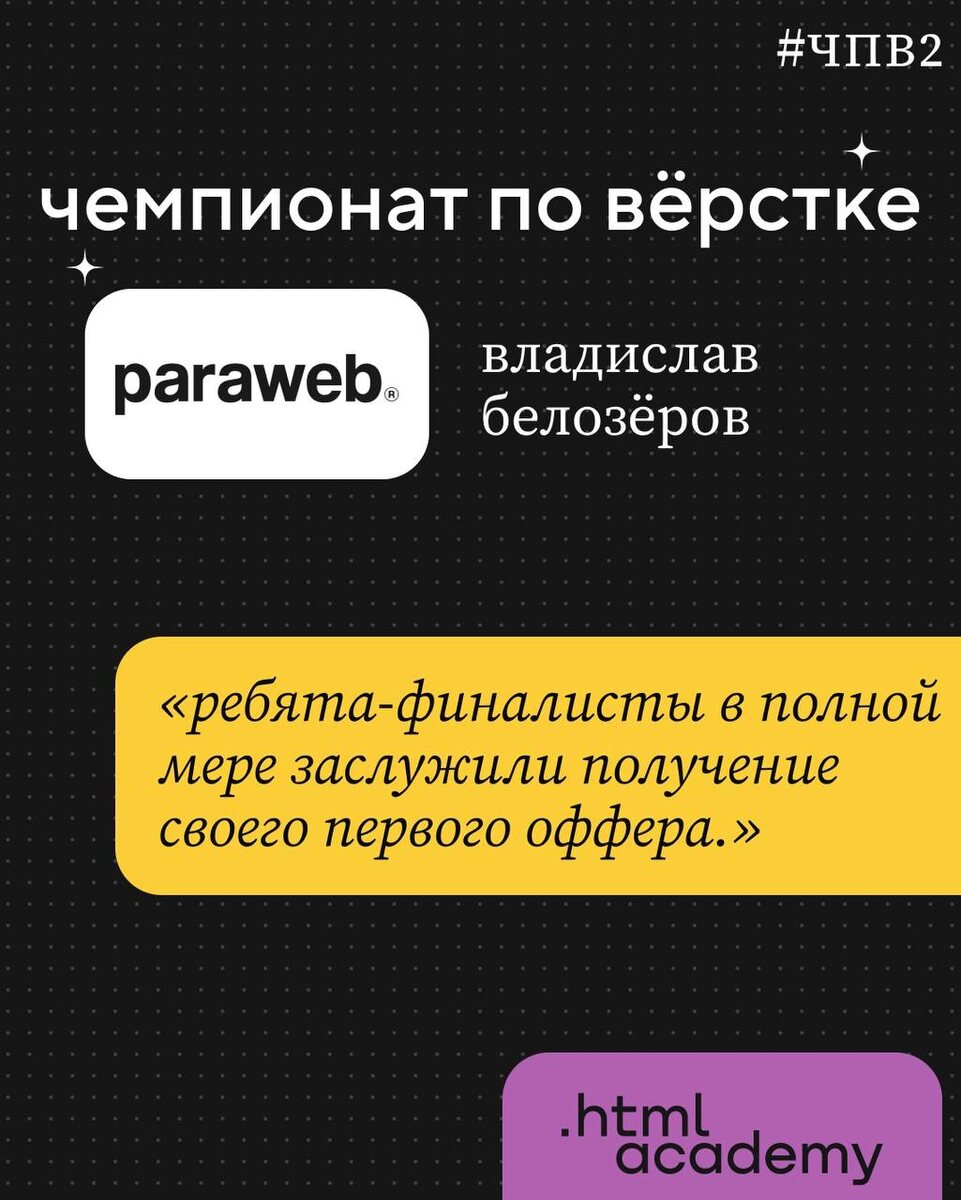 Жюри второго сезона чемпионата по вёрстке разобрало финальные работы и отметило: участники уверенно справились со сложным макетом, а качество вёрстки и подход к деталям видно сразу. «По своему опыту могу сказать, что уровень выпускников, а особенно финалистов HTML Academy, значительно выше уровня среднестатистического джуна на HeadHunter. Сегодня джун-разработчик зачастую знает условный React, но при этом имеет минимальный опыт именно в вёрстке. Грамотная и аккуратная вёрстка, умение создавать красивые интерактивные компоненты — это то конкурентное преимущество, которое даёт Академия и чего сейчас не хватает многим работодателям. На мой взгляд, ребята-финалисты в полной мере заслужили получение своего первого оффера и уверенного старта карьеры в сфере веб-разработки. Если бы я, как работодатель, увидел подобную работу в портфолио, а тем более в рамках тестового задания, я бы однозначно обратил на неё внимание.» Владислав Белозёров, Paraweb «Кексобот не должен был обучать так эффек