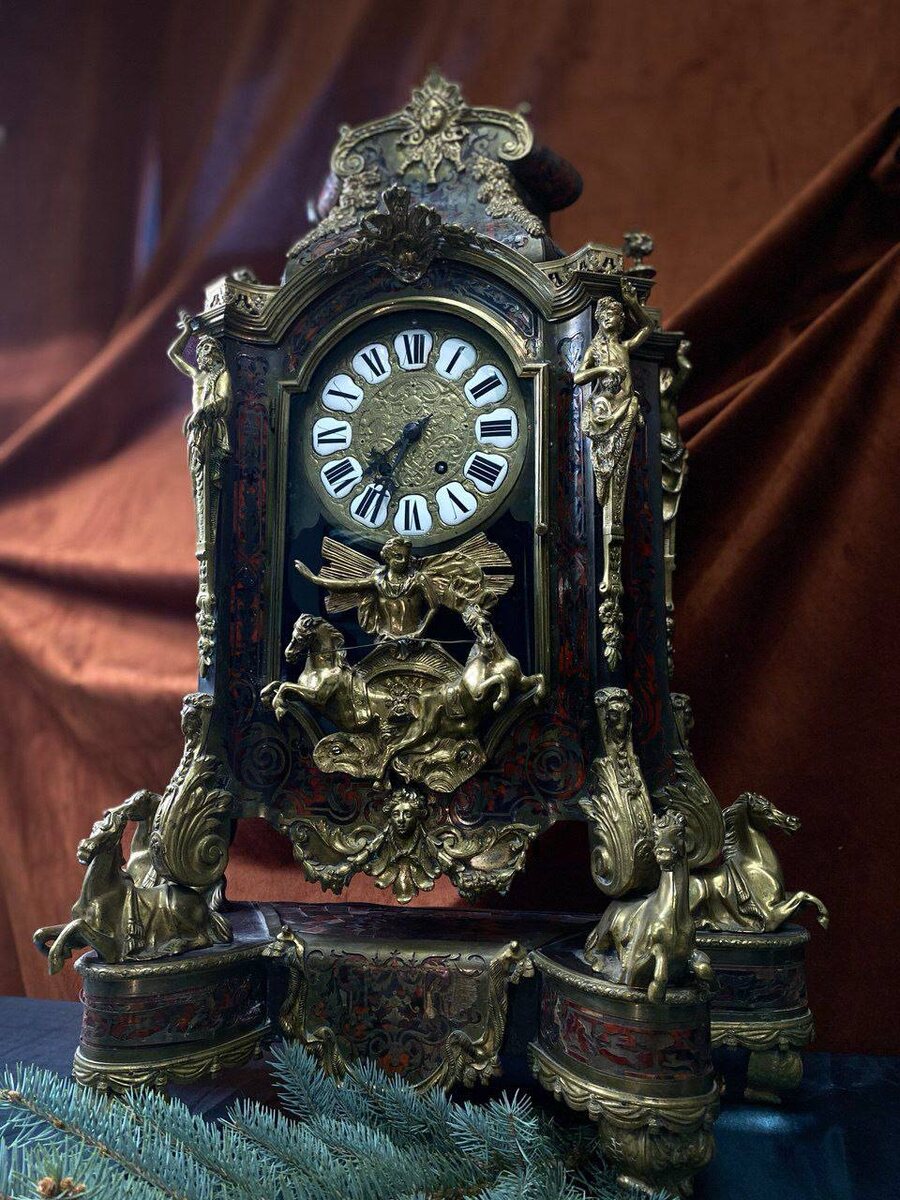 К 120-летию основания Пятигорского краеведческого музея – малоизвестные факты, события, персоналии, экспонаты» можно увидеть часы каминные конца XVIII - начала XIX вв. Часы были безвозмездно переданы музею Пятигорским горфинотделом после смерти Усовой Л.П., у которой не было наследников. Часы каминные в деревянном корпусе, облицованном панцирем черепахи и инкрустированном медным цветочным орнаментом. На фасаде навершия – символическое изображение солнца, под циферблатом – богиня утренней зари Аврора, на боковых выступах – скульптурное изображение античных богов, на постаменте – скульптуры конец, декор дополнен небольшими прямоугольными панелями, закреплёнными с обеих сторон корпуса. Все детали выполнены из позолоченной бронзы. Циферблат из медного сплава с ажурным рисунком в виде завитков, миниатюрных виноградных гроздей, апельсинов и других растительных элементов. Цифры римские, черного цвета нарисованы на эмали. Часы с искусной отделкой корпуса, включающей детали, характерные для