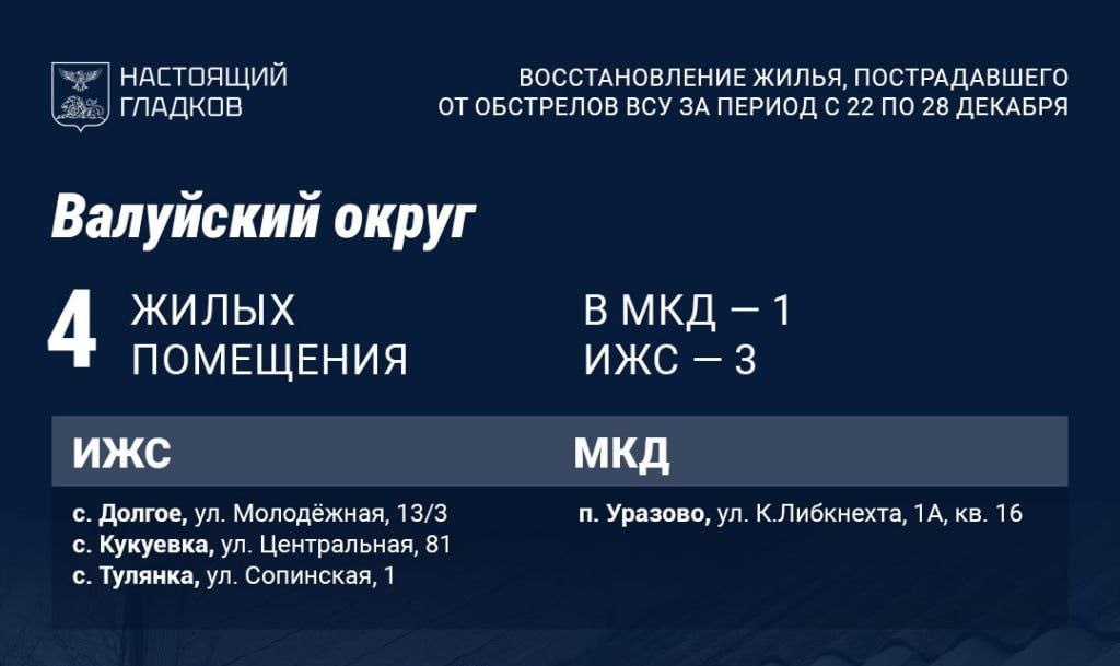 С 22 по 28 декабря в Валуйском округе было восстановлено 4 объекта.