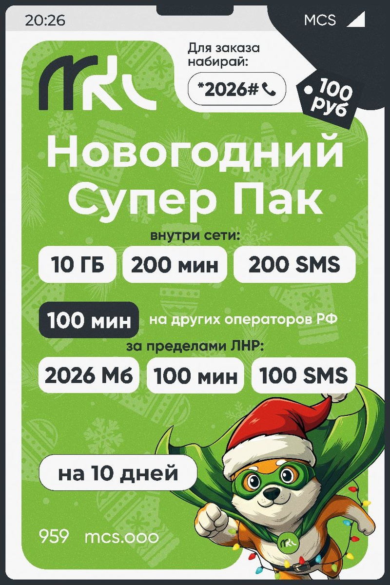» Оператор МКС предложил своим абонентам подключить новогодний «Супер Пак 2026», который будет действовать в праздничные дни. В пакет включено ✔ 10 Гб. интернет-трафика внутри сети «МКС». ✔ 200 минут исходящих звонков внутри сети. ✔ 200 SMS внутри сети. ✔ 100 минут исходящих вызовов на номера других операторов РФ. ✔ 2026 Мб. интернет-трафика за пределами ЛНР. ✔ 100 минут исходящих за пределами ЛНР. ✔ 100 SMS за пределами ЛНР. ✔ Цена вопроса: 100 ₽. ✔ Подключить пакет можно командой *2026#. ✔ Срок действия пакета — 10 дней. 📱 Про операторов | Подписаться