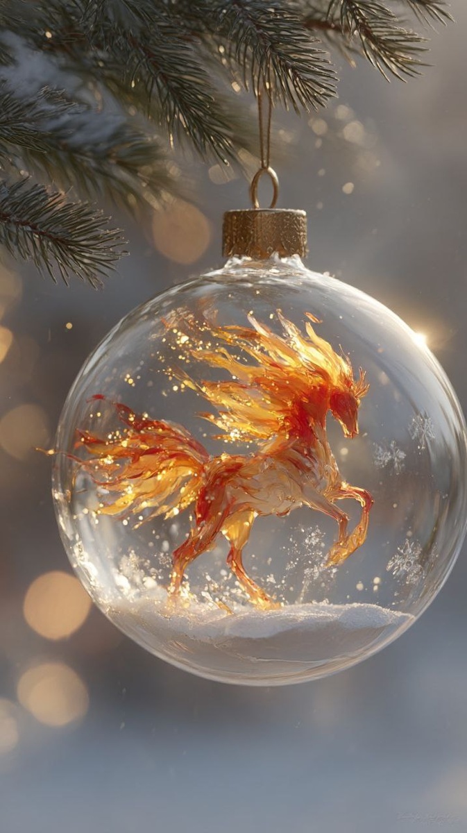 Inside the transparent ornament is a fiery red horse, depicted in a magical realism style. It appears as if it is made of light and flame: its mane and tail glow with golden sparks, creating a sense of motion and energy. The horse stands on a layer of soft white snow, as if inside a tiny winter world. Delicate white snowflakes and fine snow particles are scattered across the glass, enhancing the feeling of enchantment and celebration. The glass is perfectly clear, catching soft reflections of the surrounding light. Outside the ornament, deep green fir needles frame the scene, while the background fades into warm, softly blurred holiday lights, creating a gentle bokeh effect. The color palette blends cool winter tones with warm golden highlights, giving the image a cinematic and cozy feel. Overall, the image conveys a fairytale-like, magical Christmas atmosphere, symbolizing strength, movement, and wonder--more than just a decoration, it feels like a living miniature world captured insi