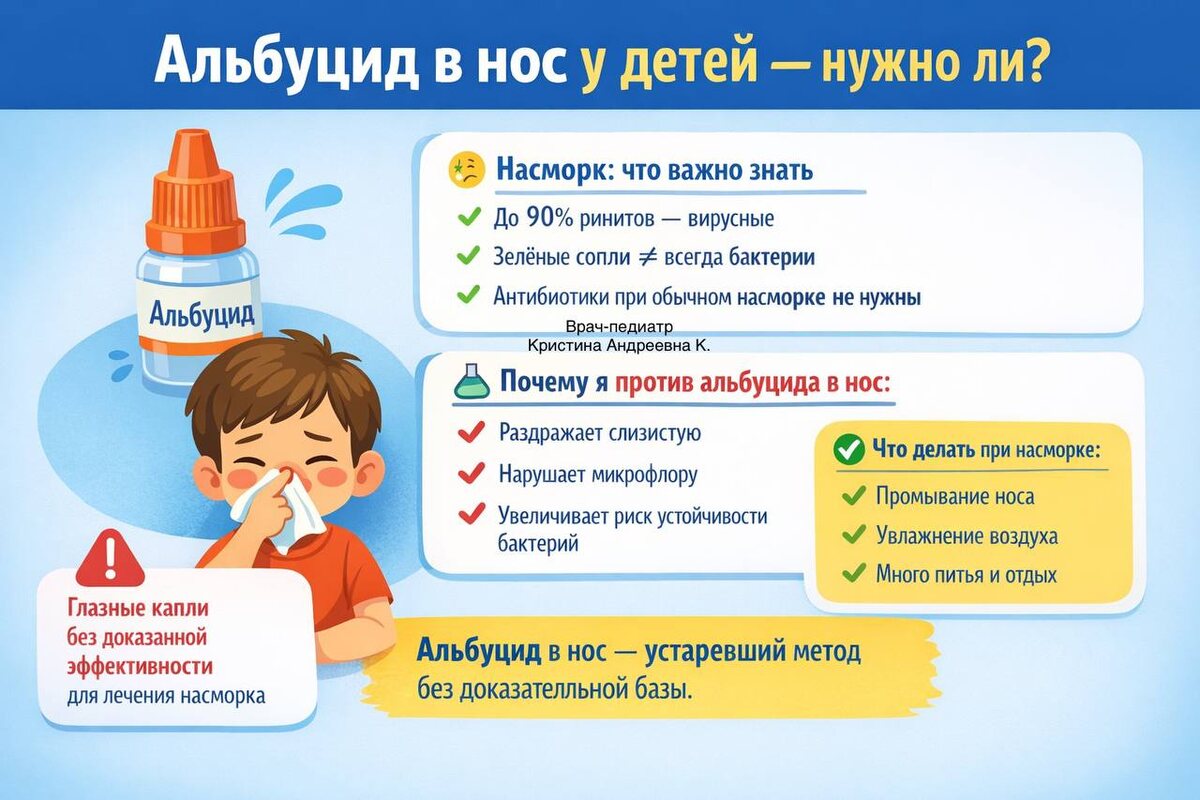 ? ➗➗➗➗➗➗➗➗➗ В педиатрической практике до сих пор можно встретить рекомендацию закапывать альбуцид (сульфацил натрия) в нос ребёнку при насморке. Разберёмся, оправдано ли это с точки зрения современной медицины. ❓Что это за препарат? Альбуцид — антибактериальные глазные капли из группы сульфаниламидов. ➡️показания — бактериальные инфекции глаз ➡️Применение в нос — off-label, без доказательной эффективности ✔️Насморк у детей: что важно знать ✨До 90% острых ринитов у детей имеют вирусную природу ✨Зелёные или жёлтые выделения не равно бактериальная инфекция. ✨При обычном, неосложнённом насморке антибиотики не нужны, в том числе местные ❓Что говорит доказательная медицина? ➡️Нет клинических исследований, подтверждающих эффективность альбуцида при рините ➡️В международных рекомендациях (EPOS, AAP, NICE) нет показаний к его применению в нос у детей ‼️Почему я не рекомендую альбуцид в нос ребёнку ➡️может вызывать жжение и раздражение слизистой носа ➡️нарушает местную микрофлору ➡️способст