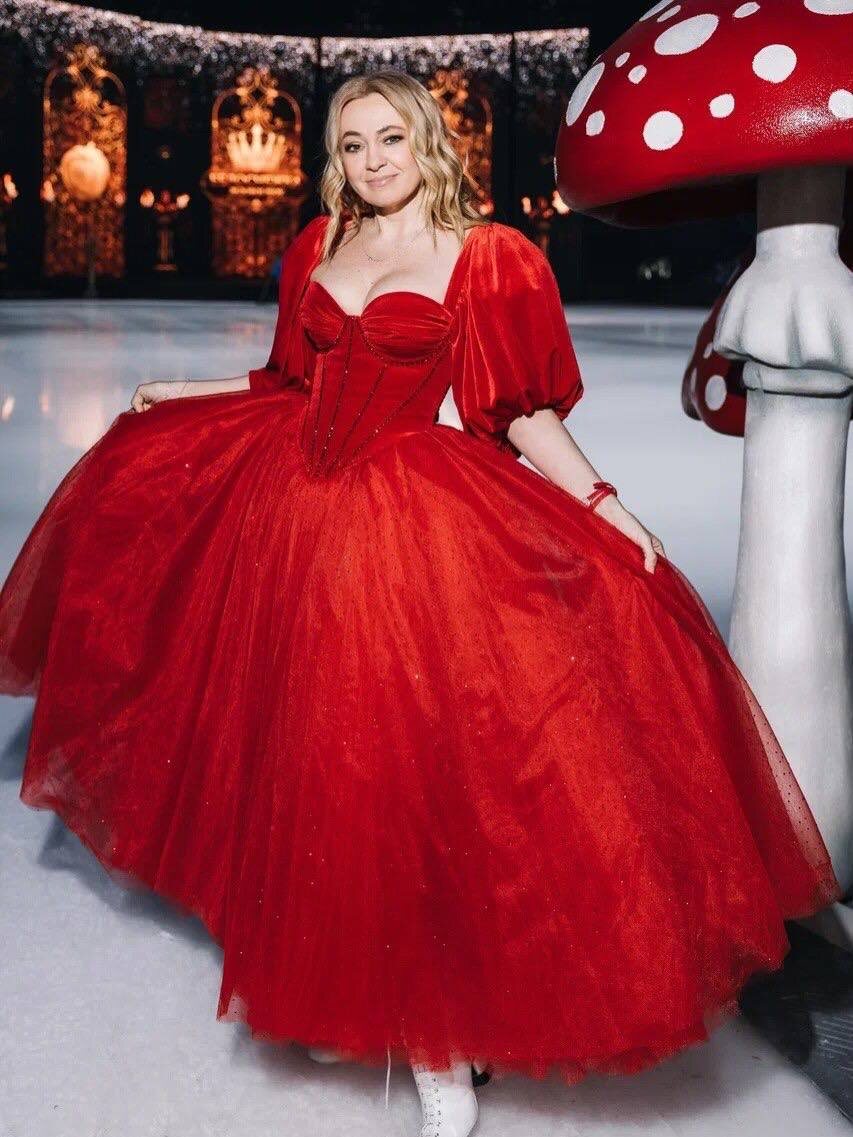 На премьере ледового шоу «Белоснежка» продюсер Яна Рудковская предстала в изысканном красном платье от Solangel