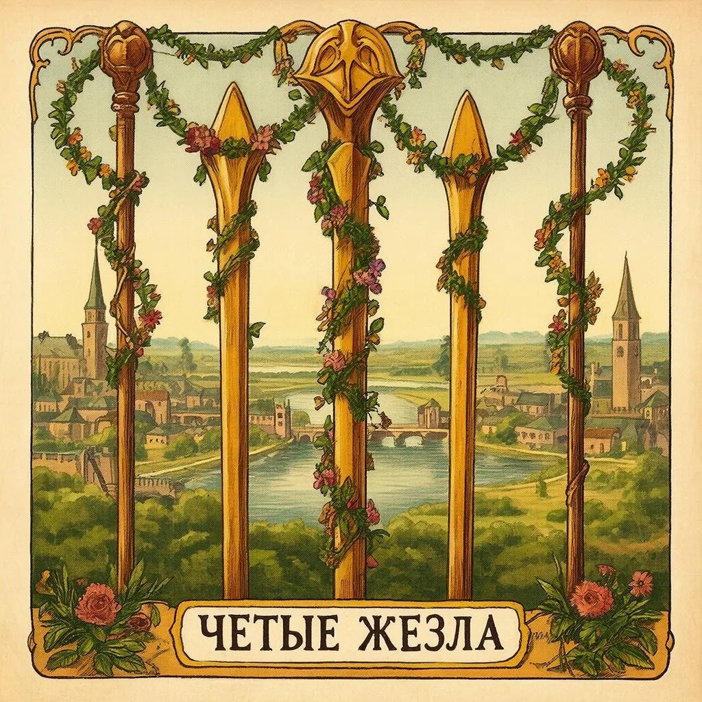 Здравствуйте, мои дорогие! С вами Елена, и сегодня на нашем духовном разборе — одна из самых светлых и радостных карт в колоде! Встречайте — Четверка Жезлов. Если она выпала вам как карта дня, считайте, что вселенная отправляет вам приглашение на праздник. Не на громкий карнавал, а на тот самый, душевный, домашний и очень-очень заслуженный.
