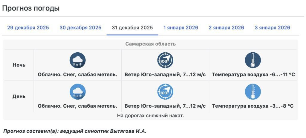 Гидрометцентр сообщил ульяновцам, что в последнюю ночь уходящего года в область придет холодный атмосферный фронт. Это приведет к снижению температуры, прекращению осадков и уменьшению облачности. Ветер стихнет, однако мороз усилится. Прогнозируется, что ночью с 31 декабря на 1 января воздух остынет до минус 11 градусов. Местами возможны небольшие осадки в виде снега и слабые метели. https://dzen.ru/id/6803cc7e0d449978de968f82
