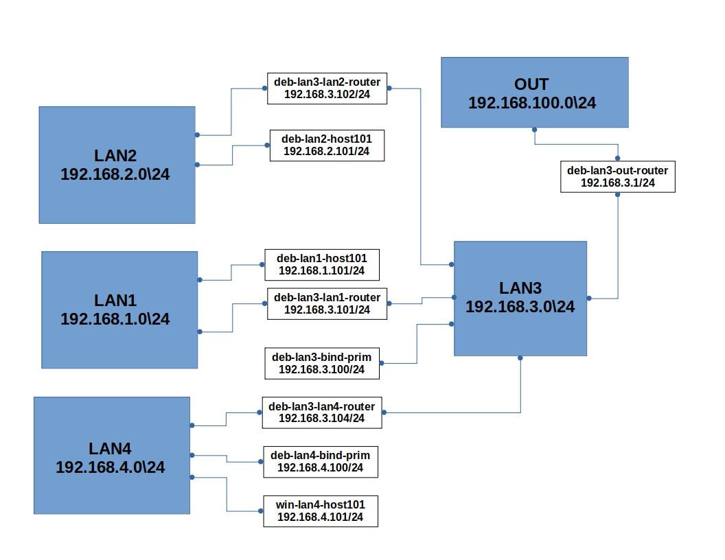Здесь хост deb-lan3-bind-prim будет играть роль первичного DNS сервера, настройкой которого мы займёмся в следующей статье, пока просто настроим ему сеть, и выход в Internet.
