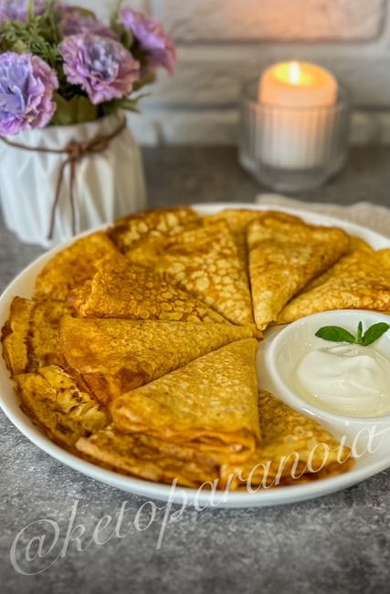 Очень жду от вас ❤️❤️❤️ и обратную связь 💬, ведь я для вас очень стараюсь! Одни из самых вкусных блинчиков, что мне приходилось пробовать! Тыква придает блинам яркий цвет, а специи - нежнейший вкус и аромат. Автор 🎥 ketoparanoia Состав: 🎃Пюре из тыквы 80 г 🥚Яйцо 4 шт (С0, комнатной температуры) 🥛Сметана 80 г 🥄Псиллиум 7г 🥄Разрыхлитель 1/2 чл 🥄Сахзам, ванилин 🥄Корица 1/2 чл 🥄Масло оливковое 1 ст л 💧Вода 100 мл (+-по необходимости) Приготовление: 1. Приготовить тыквенное пюре (я режу тыкву на большие куски и запекаю в духовке 40 мин. Снимаю кожу и пюрирую при помощи погружного блендера) 2. В миске соединить пюре тыквы, яйца, сметану, масло, сахзам, ванилин, корицу и пробить массу погружным блендером 3. Добавить в псиллиум, перемешать. Оставить тесто на 30 минут. 4. Оценить консистенцию теста и, при необходимости, добавить в него воды (я добавляла дважды по 50 мл) 5. Жарить на сковороде, смазанный маслом, на медленном огне, с двух сторон. Блинчики очень нежные, поэтому потре