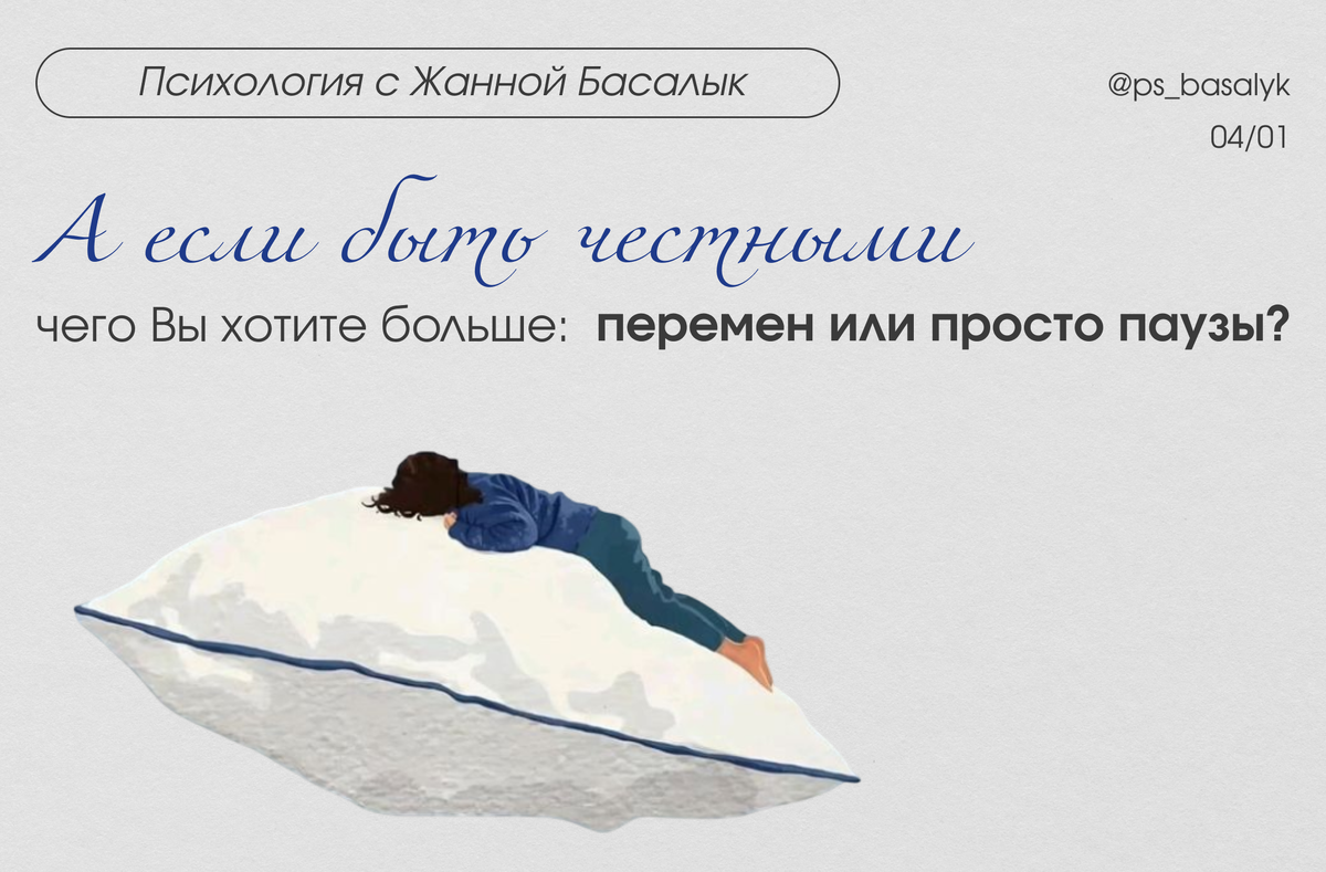 «Хочу всё изменить» Но если быть честными с собой, часто за этим стоит другое желание — чтобы от Вас хотя бы ненадолго ничего не требовали. Без ожиданий, без оценок, без постоянного «надо». Если Вы узнаёте себя — это не слабость и не лень, а психологическое истощение. Чаще всего 4–5 января люди чувствуют: И при этом внутри звучит мысль: «Со мной что-то не так. Мне срочно нужны перемены». С точки зрения психологии — это не так. когда человек долго живёт в режиме требований и контроля, его психика переходит в режим защиты, а не развития. В этом состоянии: Это состояние хорошо известно в психологии как эмоциональное и когнитивное истощение. Здесь есть важный психологический парадокс. Когда у человека нет ресурса,