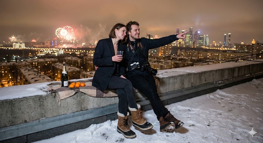 Ветер здесь был сильным, пронизывающим, но вид... Весь город лежал перед ними как на ладони. Миллионы огней сливались в единое, живое море света. Снег здесь, на высоте, казался чище и ярче.