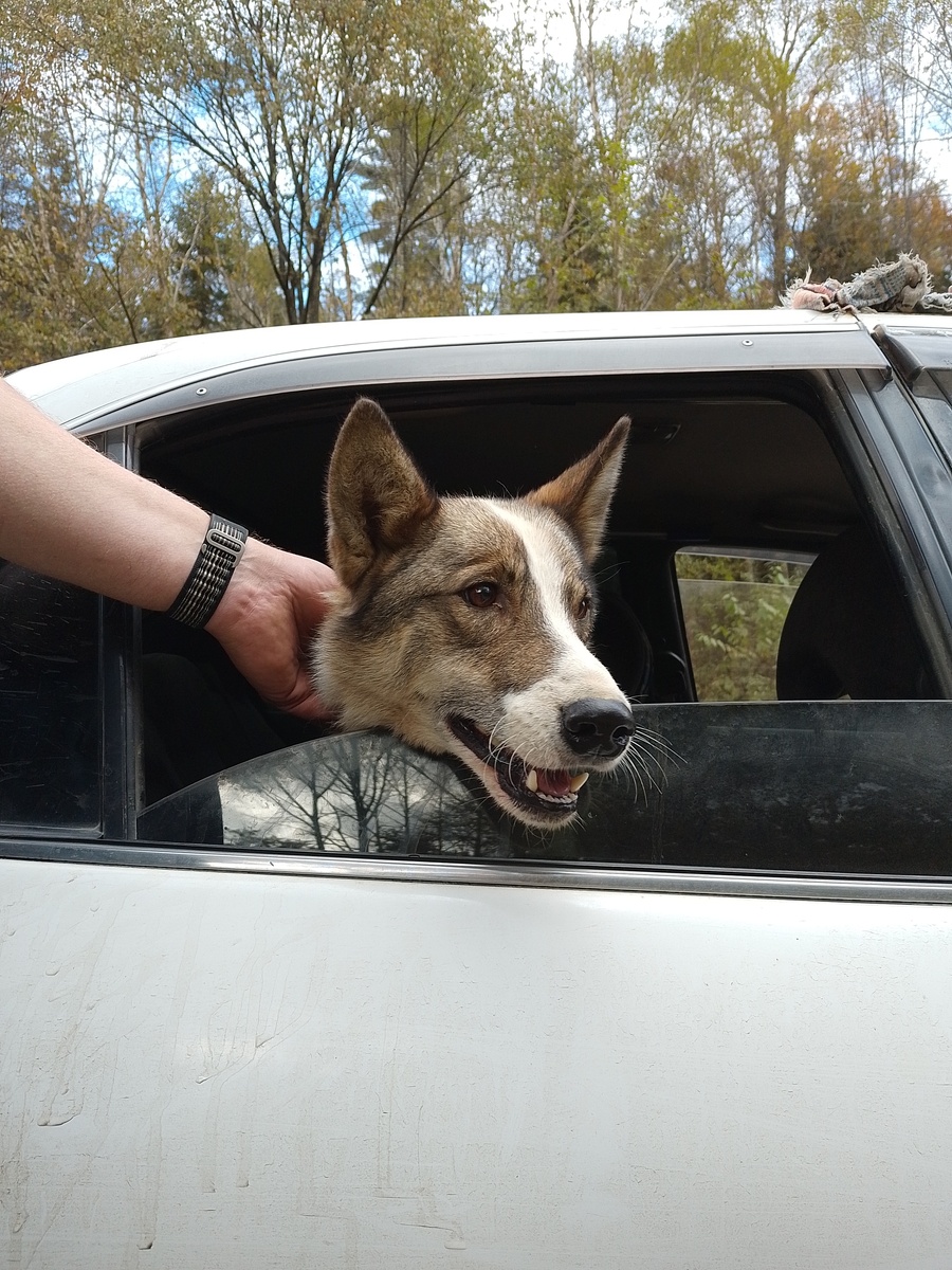 На самом деле он уже год с нами живёт, с сентября 2024 года. Ехали в Рощино со стороны Мельничного. На обочине дороги лежал пёс, красивый, не уходил. Через 4 часа поехали обратно и он все ещё лежал. Вышли посмотреть, жалко стало. Думали может машина сбила или старый и больной. Забрали домой. Он не мог ходить, задании лапы не слушались. В итоге через два дня вполне стал бодрый. Думаю он просто был истощен. Знал команду - дай лапу, на остальные команды не реагировал.Следы от ошейника на шее. Не агрессивный, спокойный. Похож на западно-сибирскую лайку. Места тут охотничьи, так что почему б и нет. Вольера у нас нет, поэтому натянули железный трос несколько метров и на него надели цепь. В течении года вывозили его гулять, не каждый день, ну пару раз в неделю. Не убегал, прибегал к машине. Реагировал на проезжающие джипы. Через год наконец стал отзываться на кличку. Прежнюю мы не угадали, пришлось придумывать новую. Видимо знал что такое палка и как ей бьют, потому что когда я взяла палку по