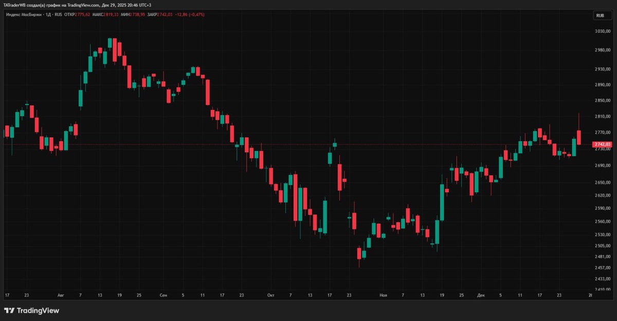 Что в итоге? 📝 Весь новостной вынос, что был проторговали, причем так, что сформивалось шортовое закрытие с длинным фитилем сверху. Плюсом ко всему новости постепенно начинают стихать, а значит и драйвера для роста не будет, ведь весь 2025 цена в основном росла на новостях. ✅ Еще и куча физиков как всегда начали закупаться на самом хае. Поэтому отсюда вывожу, что скорее всего в ближайшее время будет падение в сторону гэпа 2715, ну а там дальше будем смотреть по факту. Единственное, так как сегодня было резкое падение может быть небольшой отскок вверх, к 2760-70 и уже от туда движение вниз. В целом завтра последний рабочий день в году, а значит вероятно, что резких движений не будет. Следовательно краткосрочно жду падение к 2715-20, а завтра лишь локальное движение в сторону проторговки вечернего выноса, а именно падение к 2740~. Всем хорошего вечера! 🤝