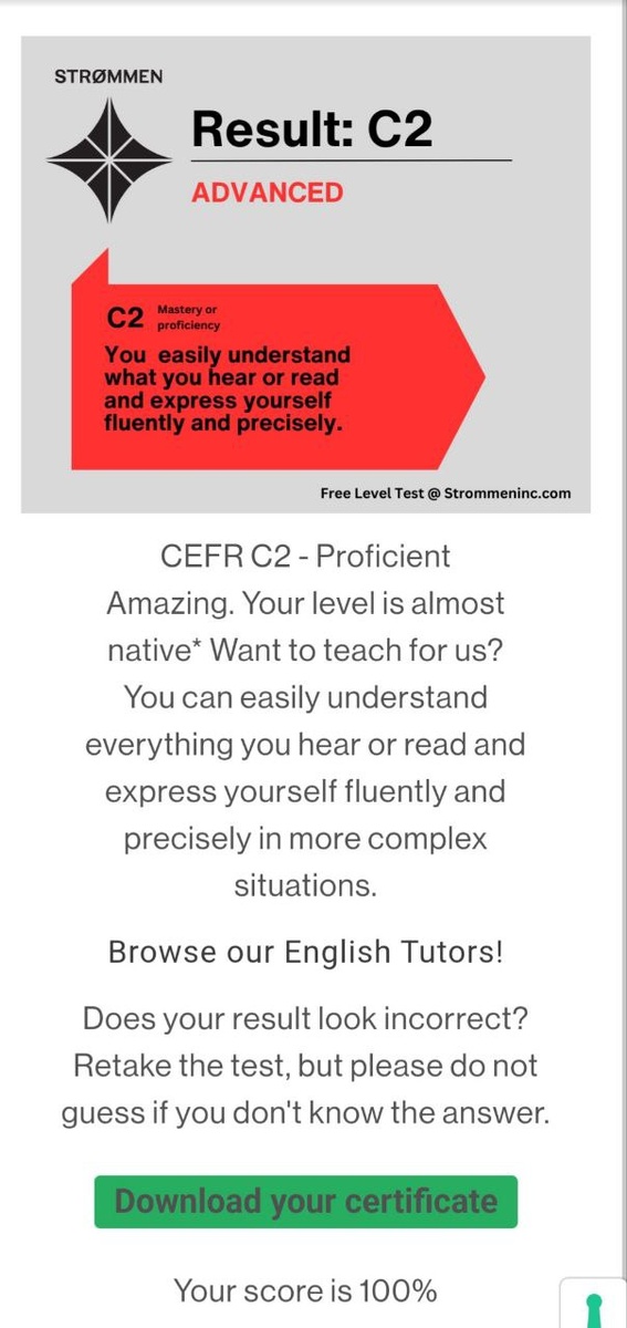 Нашла неплохой тест по грамматике, который помогает определить примерный уровень языка буквально за несколько минут. Перед пробным уроком с новым студентом я люблю давать такие тесты, чтобы подготовиться ко встрече и подобрать подходящие материалы. Что мне понравилось, в отличие от кэмбриджского теста, так это возможность выбрать вариант "не знаю" и даже завершить тест досрочно. Последнее удобно, потому что сложность нарастает постепенно. А то в кэмбриджском иногда у меня студенты случайно умудряются натыкать себе уровень, которого у них совсем нет. 😁 А ещё некоторые умудряются делать такие тесты с переводчиком. О достоверности результатов тут говорить не приходится. 😆 Попробуйте этот тест, присылайте свои результаты в комментариях, расскажите, насколько они точны, по-вашему. Мой - на скрине (правильно определил). Уровни английского (на всякий случай): А1 - начинающий, А2 - ниже среднего, В1 - средний, В2 - выше среднего, С1 - продвинутый, С2 - профессиональный. ▪️как звёзды