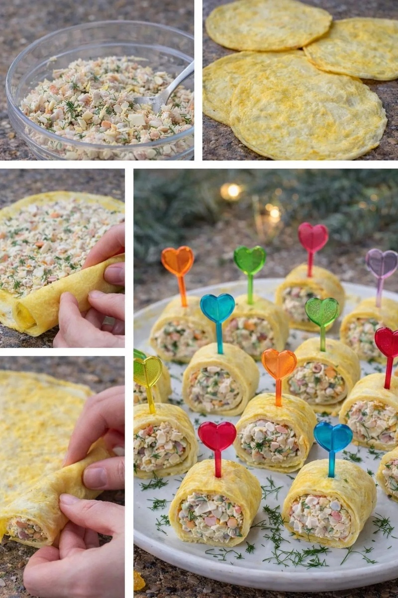 Приготовление: Каждое яйцо слегка взбейте с щепоткой соли, вылейте на разогретую сковороду тонким слоем и поджарьте с двух сторон — получится нежный омлет-блин. Крабовые палочки, сыр и чеснок натрите на тёрке, добавьте мелко нарезанный укроп и майонез. Хорошо перемешайте начинку. Равномерно распределите начинку по поверхности каждого яичного блина, аккуратно сверните рулетом и нарежьте небольшими кусочками. Для подачи закрепите рулетики шпажками или зубочистками.