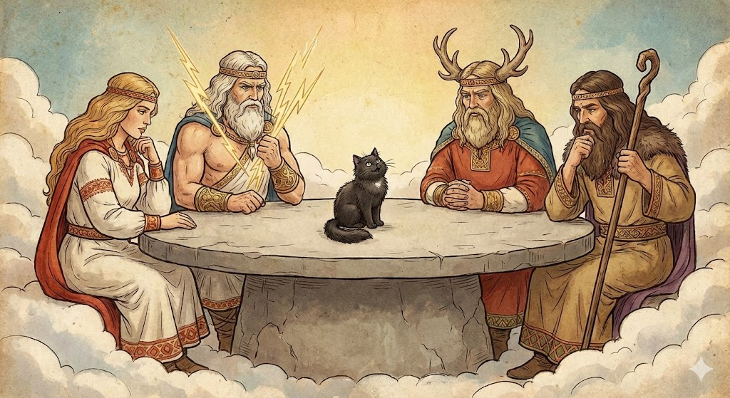 Мур-привет, мои любопытные! 🐾📜 Многие из вас спрашивают: «Откуда ты, Кот Велес, столько знаешь о людях, приметах и тайнах?» Пришло время открыть вам старую тайну. Мой род древний, мы гуляли по крышам мира еще тогда, когда ваши прадеды под стол пешком не ходили, а Сварог только раздувал свои небесные меха. Сегодня я расскажу вам легенду о том, как однажды маленький черный кот научил великих богов самому главному. Случилось это в стародавние времена. Собрались боги на пир в Ирии. Сидит Перун-громовержец, молниями поигрывает. Сидит Даждьбог, солнечным светом заливается. Сидит Макошь, судьбы плетёт. Заспорили они: «Что для человека важнее всего?»