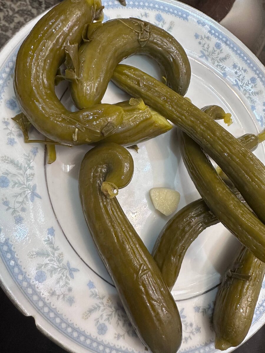 Даже солёные огурцы. Спойлер: вкусные!!!! Эти огурцы одна из родственниц принесла к столу, сама солила. Интересная форма, что за сорт такой?)) Вкус необычный, используются какие-то местные травы, очень пряные и остренькие получаются огурчики. И … засолила она их в двухлитровой бутылке от кока-колы! Я уточнила: солят в холодной воде и через несколько дней переливают уже в стеклянную банку. Как это все хранится потом без привычной мне стерилизации - я так и не поняла 😄 Вроде как секрет в «мы быстро все съедаем» #персидские_каникулы