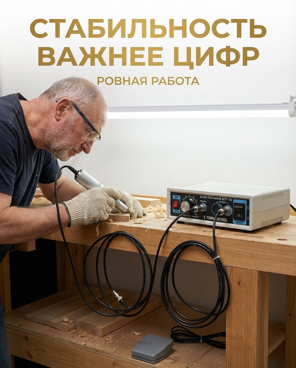 Мощность без стабильности — иллюзия. Просадки питания вызывают рывки и потерю контроля. Стабильное питание Tornadotool даёт: • ровный звук • одинаковый рез • предсказуемую работу