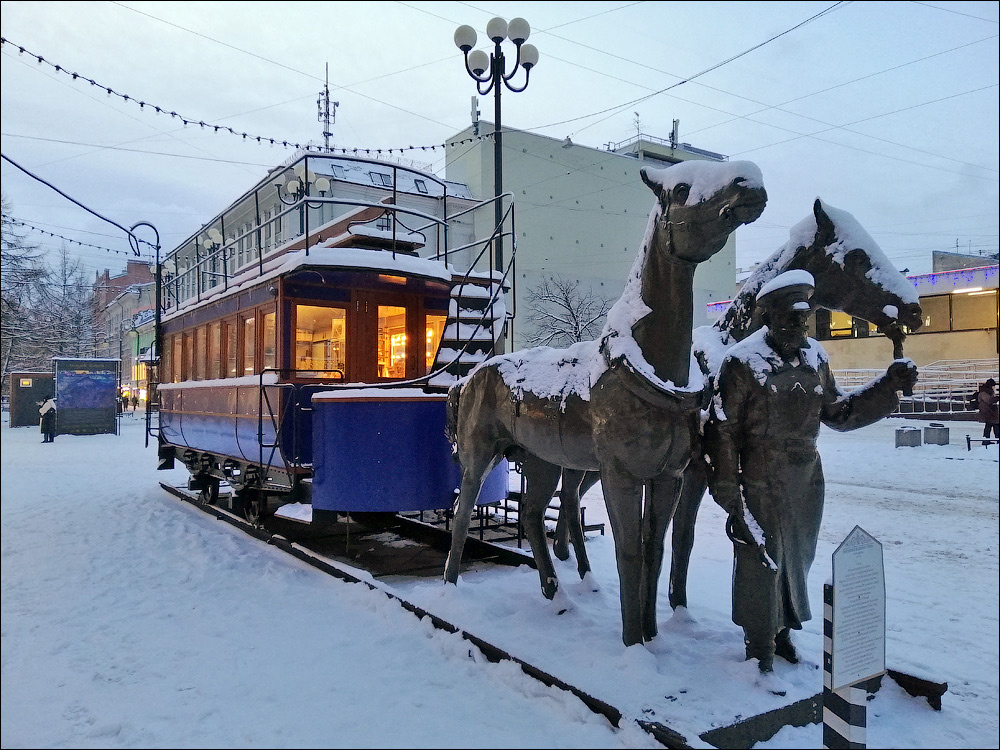 Вот и скульптурная конка, запряжённая парой лошадей. Модель 1870-х годов, воссозданная по чертежам Путиловского завода — родоначальница питерского трамвая. Внутри уютно и маняще светилась огнями кофейня...